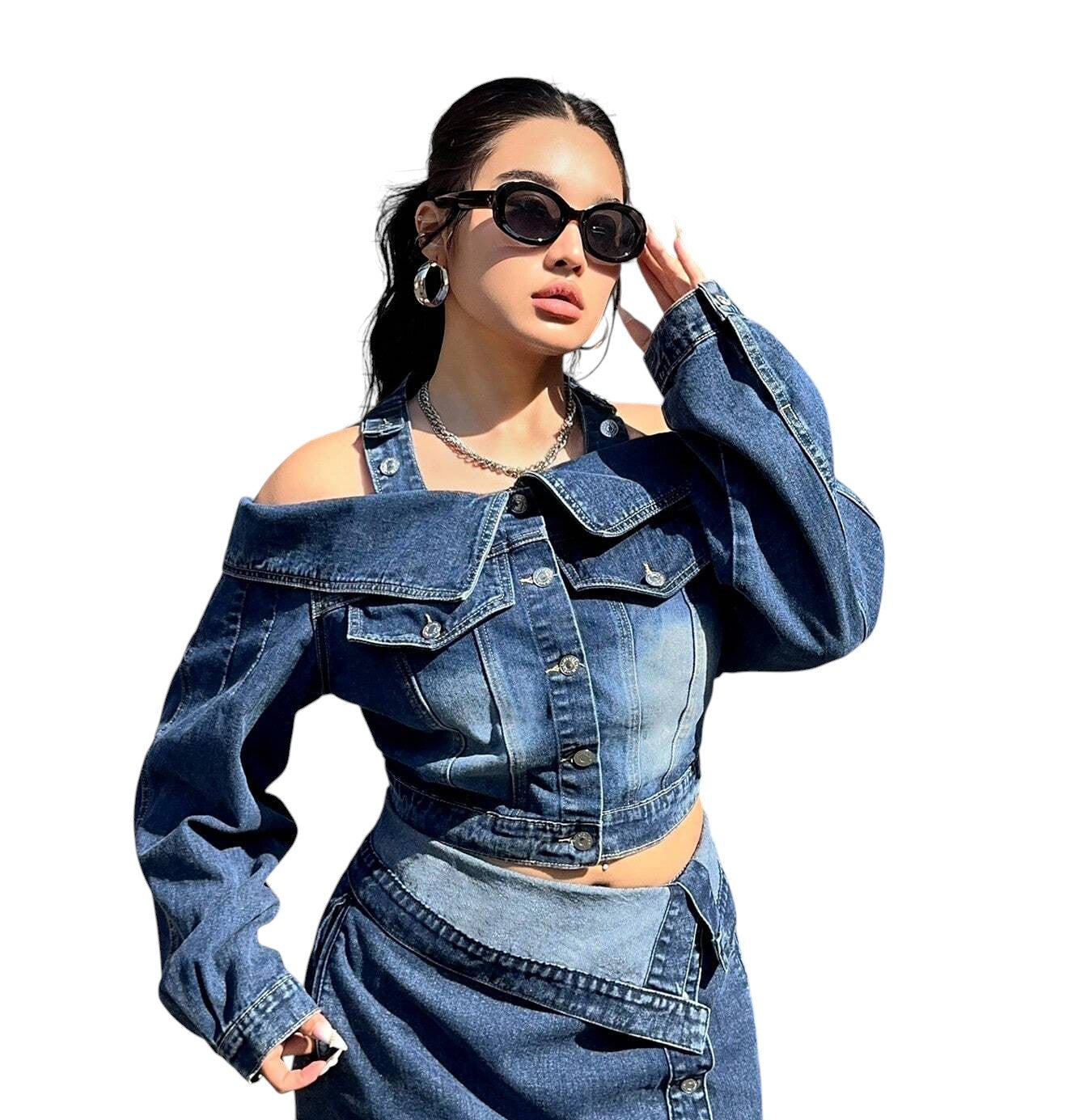 Címke nélküli, kék, vállat szabadon hagyó, hosszú ujjú crop farmerkabát
