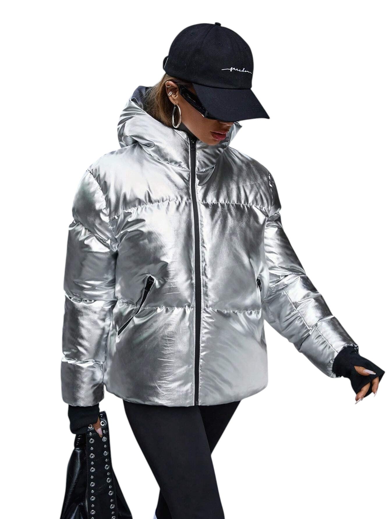 Címke nélküli, ezüst színű, kapucnis, cipzáras, hosszú ujjú puffer kabát
