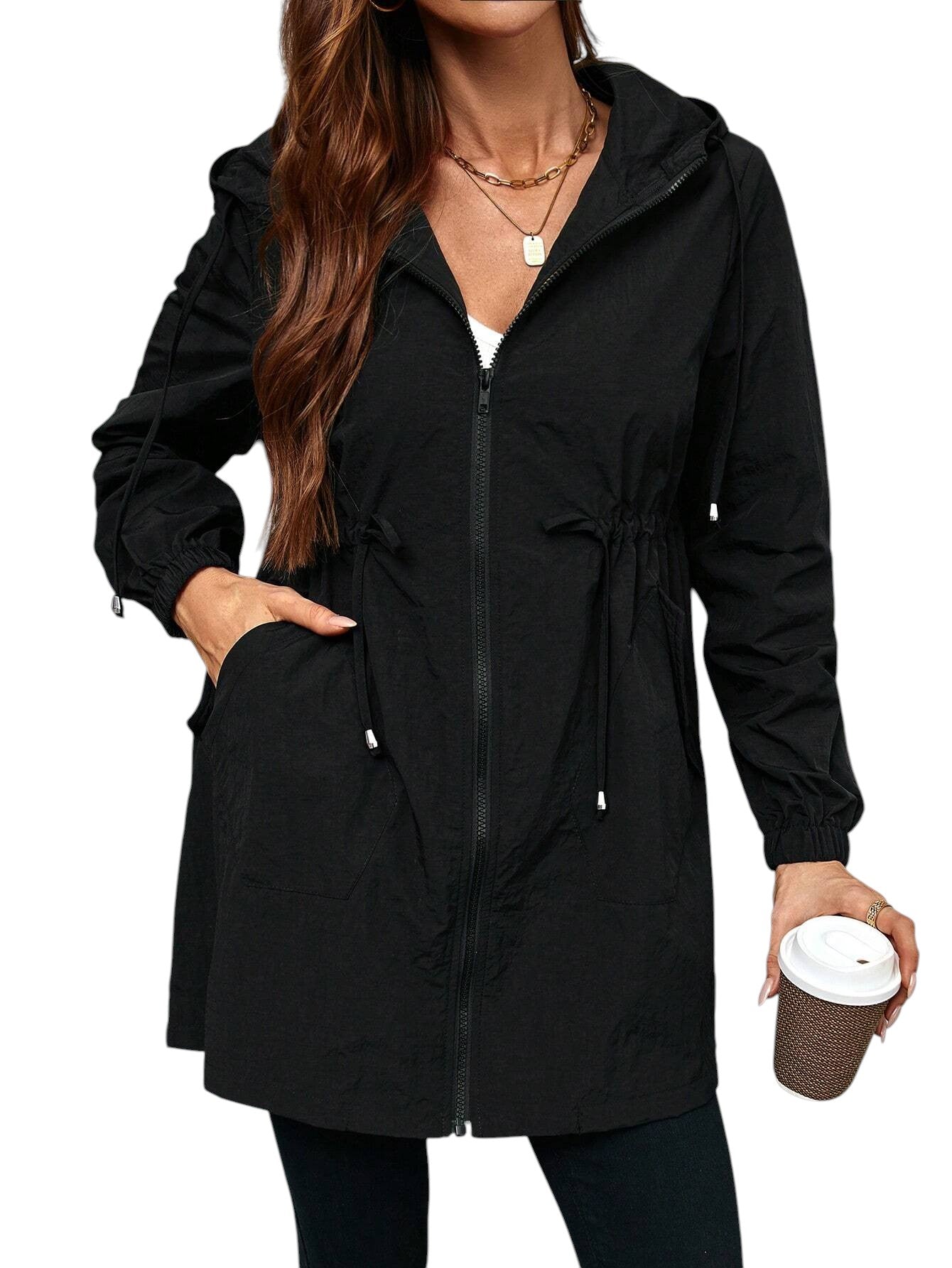 Címke nélküli, fekete, kapucnis, cipzáras, hosszú ujjú dzseki húzózsinórral a deréknál és zsebekkel