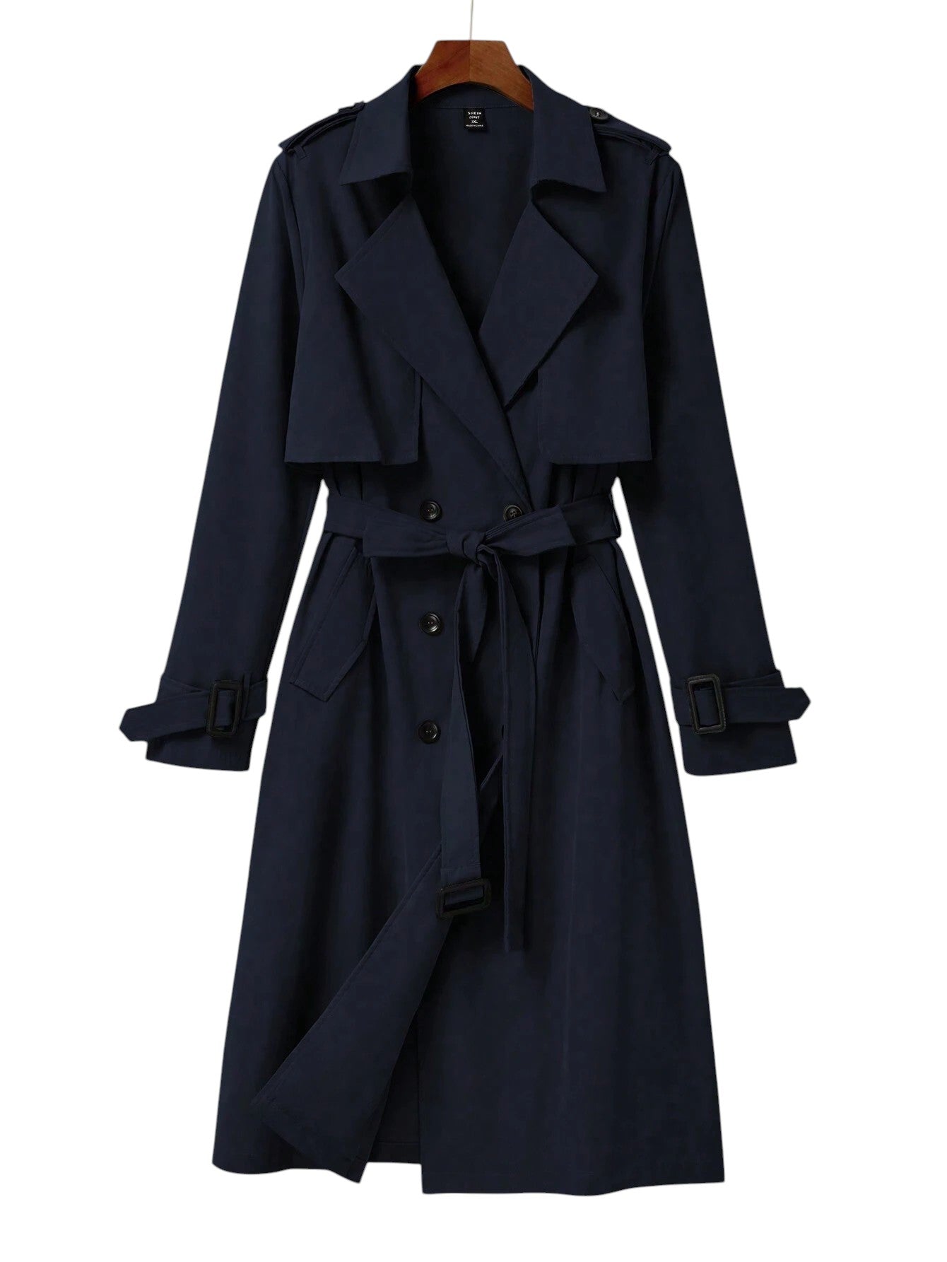 Címke nélküli, sötétkék, dupla soros gombos, öves trench kabát