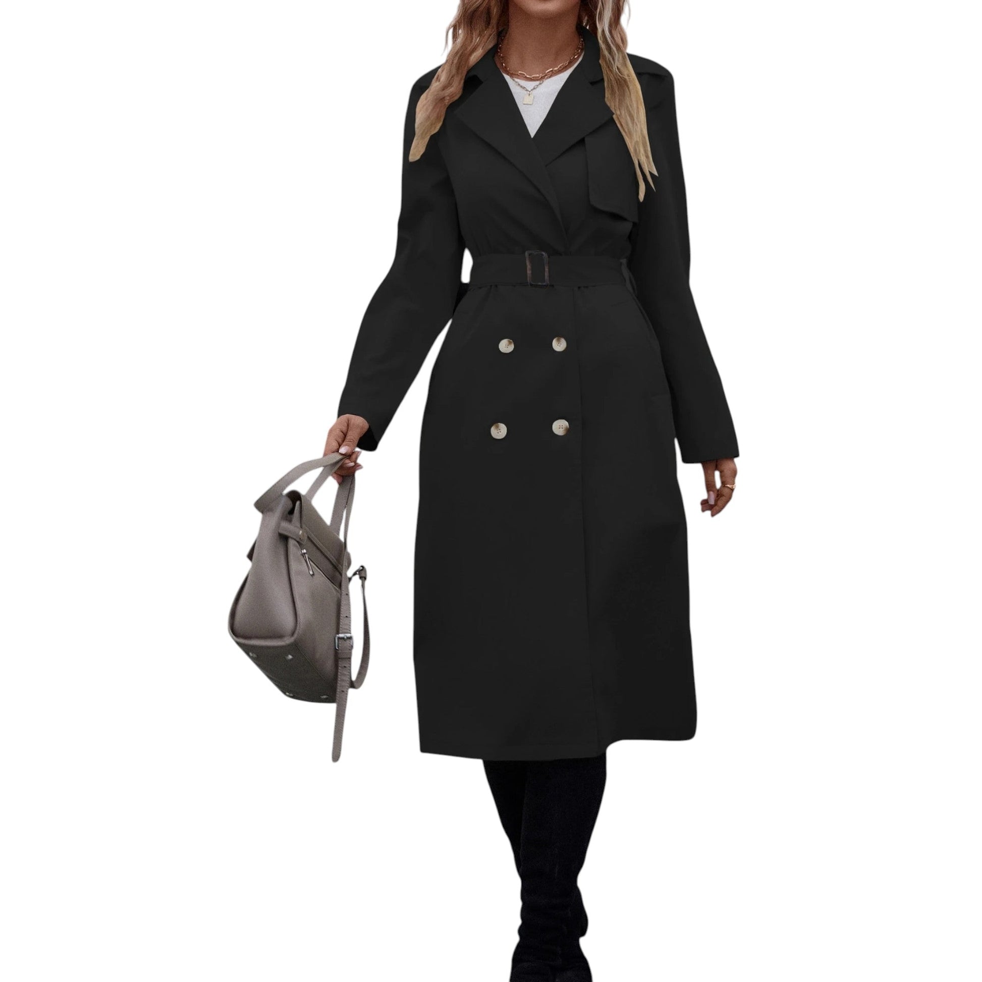 Címke nélküli, fekete, kétsoros gombolású, öves hosszú ballonkabát gallérral, hajtókákkal és vállpántokkal.
