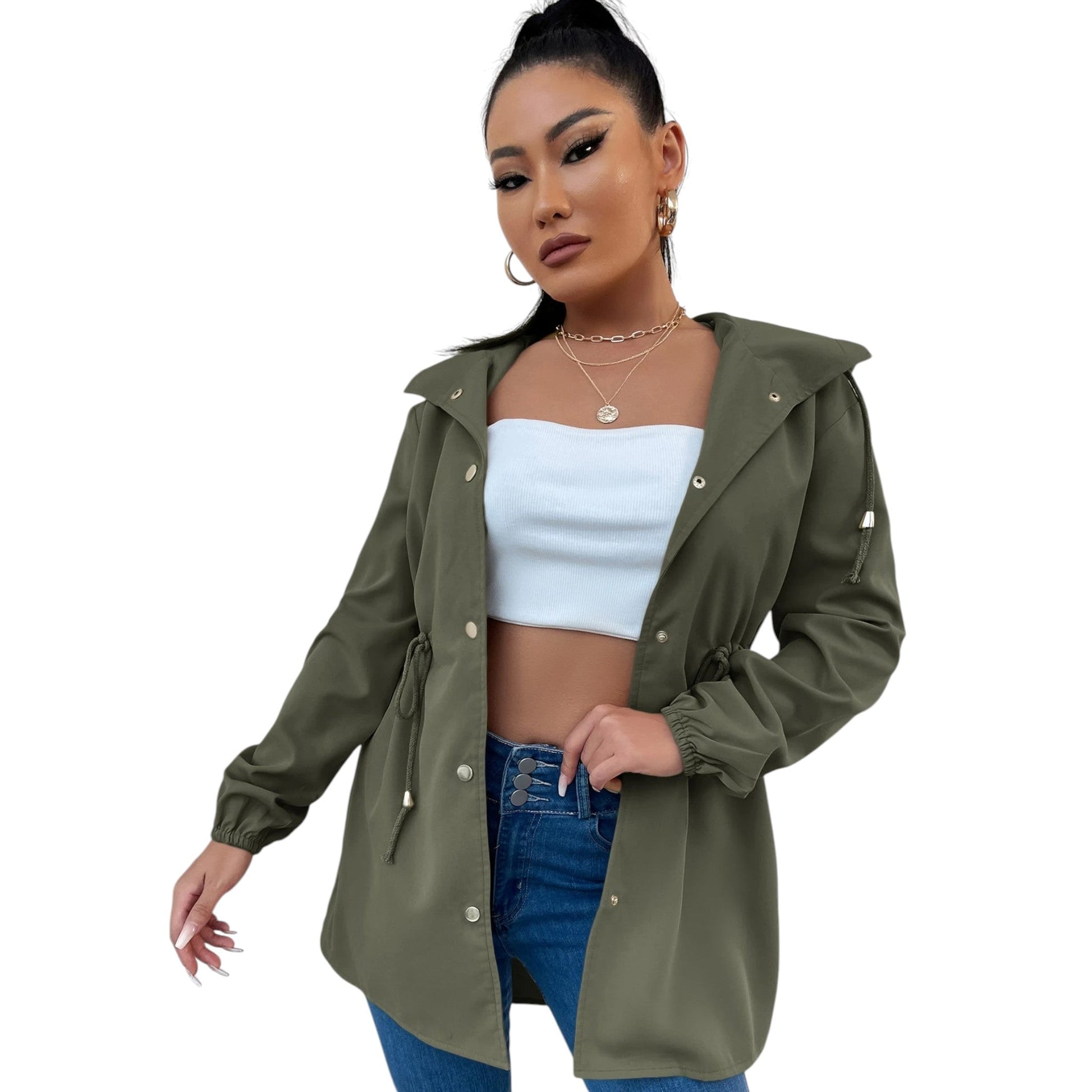 Címke nélküli, katonai zöld, kapucnis, húzózsinóros derekú dzseki elöl patentos záródással és oldalán zsebekkel.
