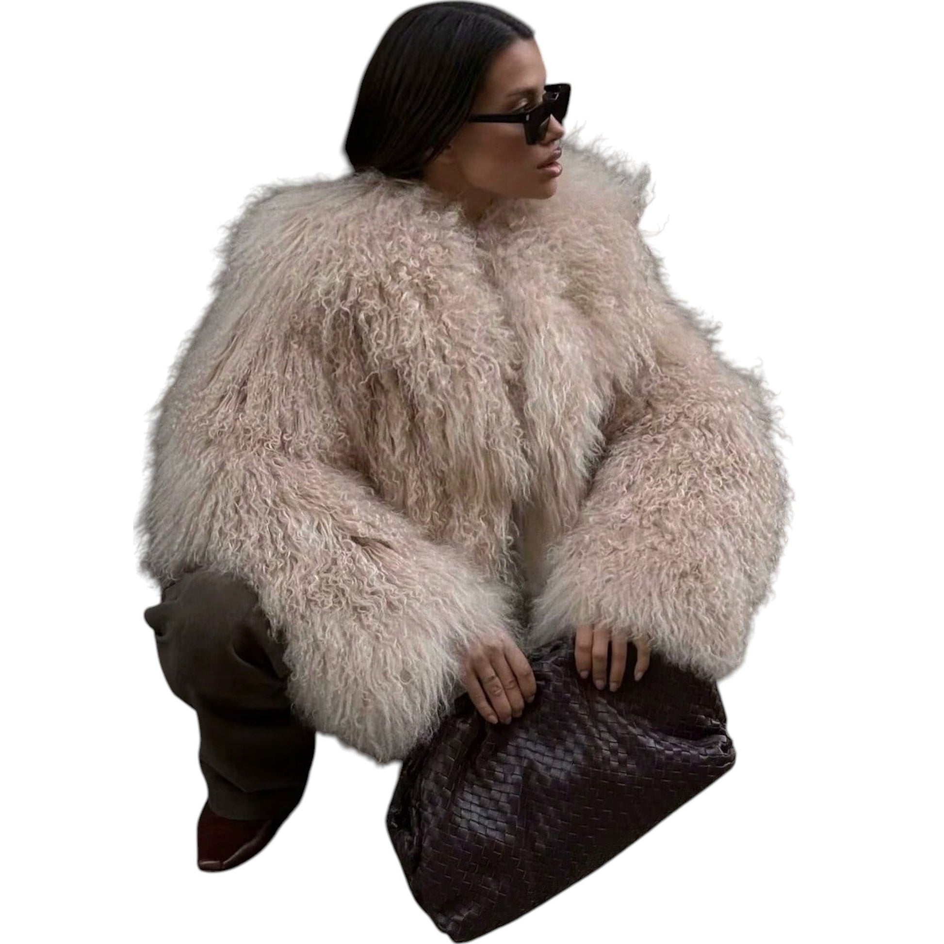 Címke nélküli, világos bézs, hosszú szőrű, bolyhos bunda kabát.
