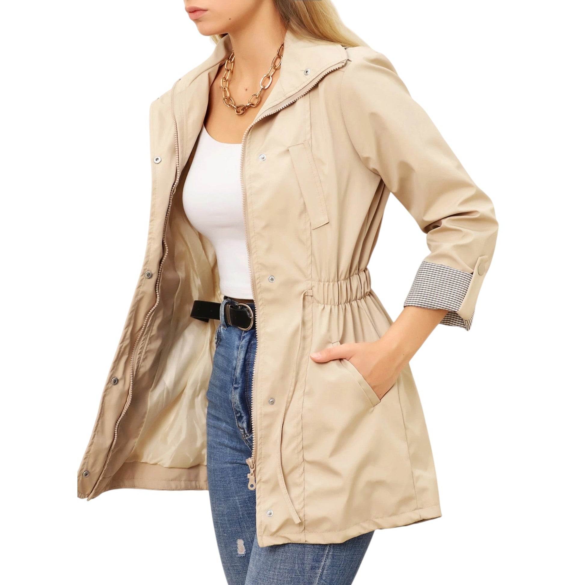 Címke nélküli, bézs, kapucnis, húzózsinóros derekú kabát cipzáras záródással és oldalsó zsebekkel, a mandzsettákon kockás béléssel.