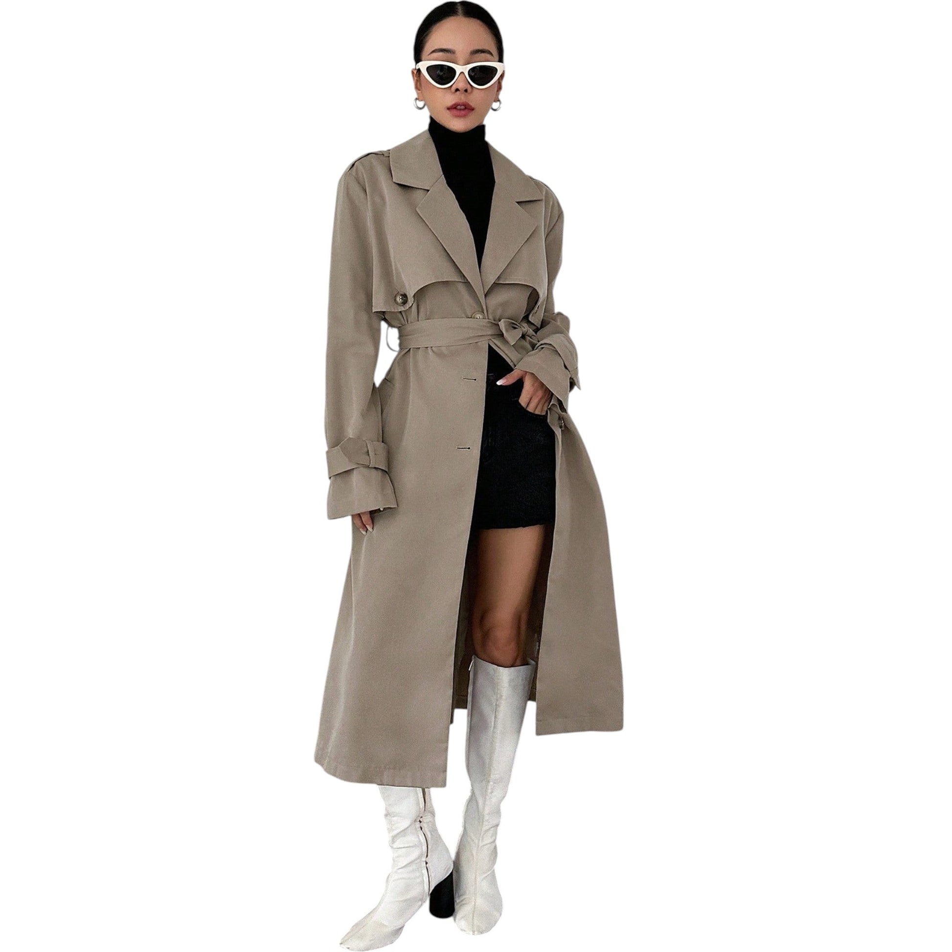 Címke nélküli, bézs, hosszú, kétsoros gombolású, öves kabát