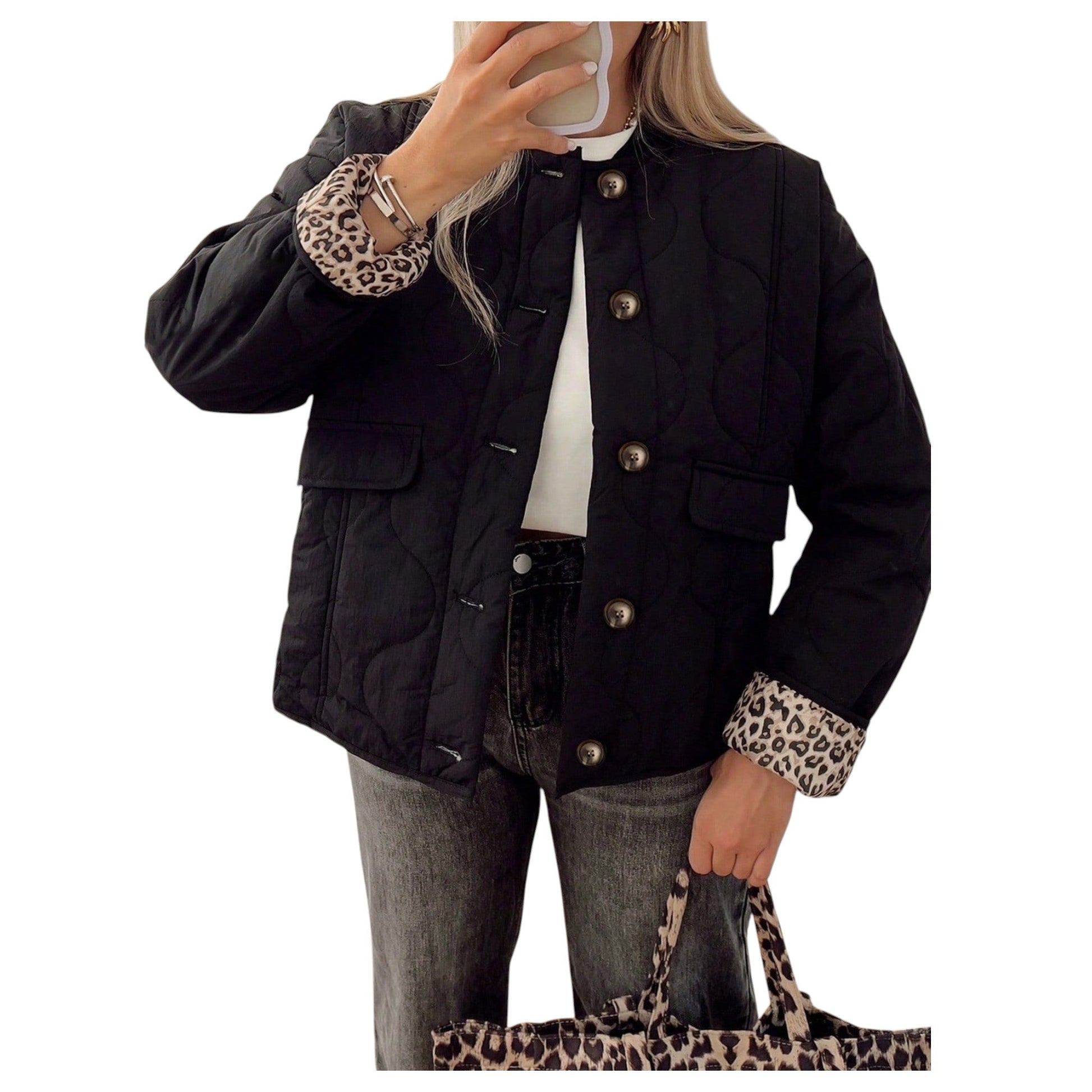 Címke nélküli, fekete, steppelt kabát, kerek nyakkal, gombos záródással és leopárd mintás béléssel az ujjaknál.