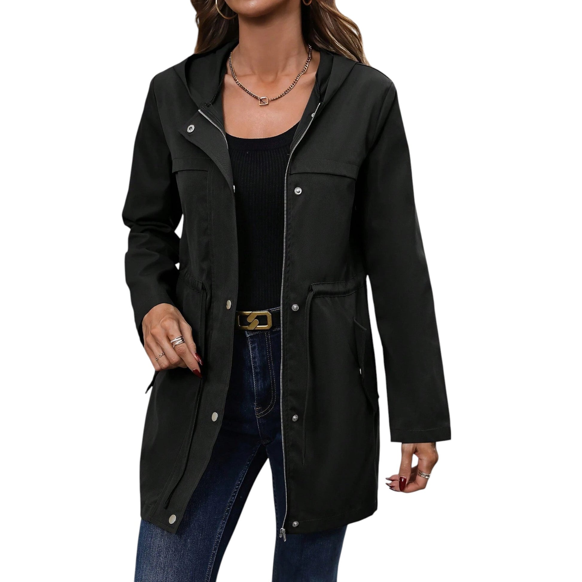 Címke nélküli, fekete, hosszú ujjú, kapucnis, zsebes, megkötős parka.