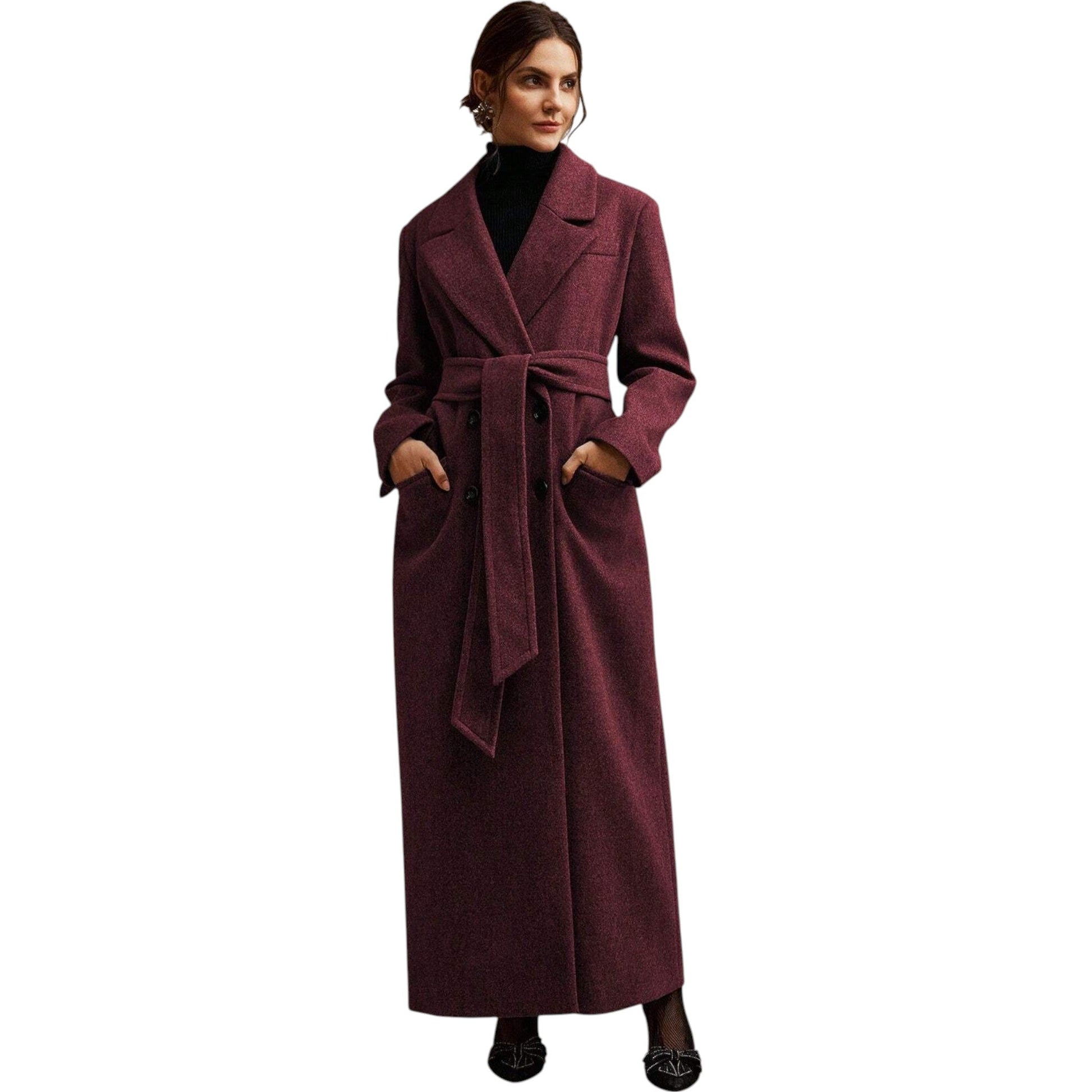 Címke nélküli, bordó, hosszú ujjú, galléros, hosszú, bokáig érő fazon, elöl gombos záródás, övvel, két oldalsó zsebbel.