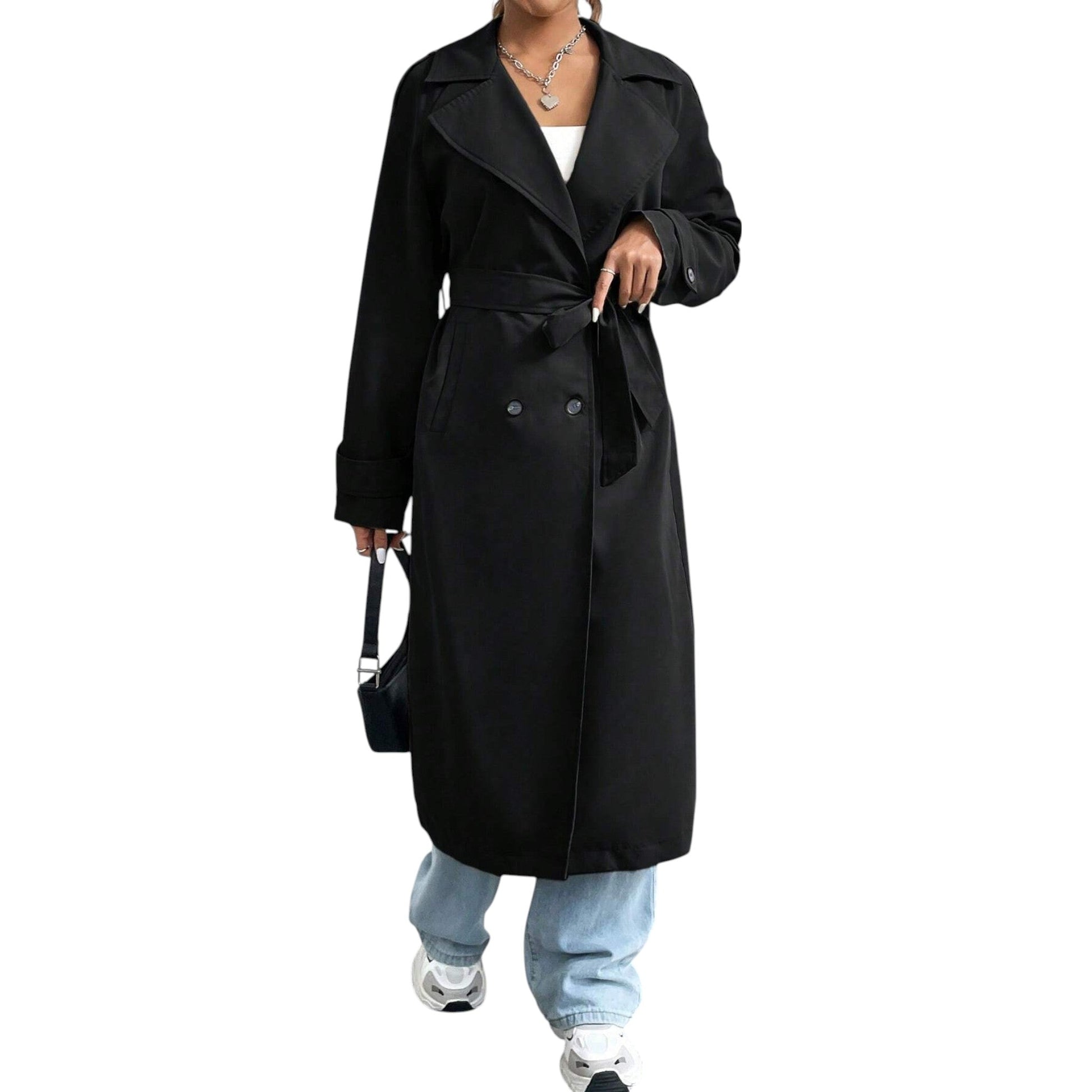 Címke nélküli, fekete, hosszú ballonkabát, megkötős derékkal, hajtókás gallérral, hosszú ujjakkal, zsebes, kétsoros gombos rögzítéssel.