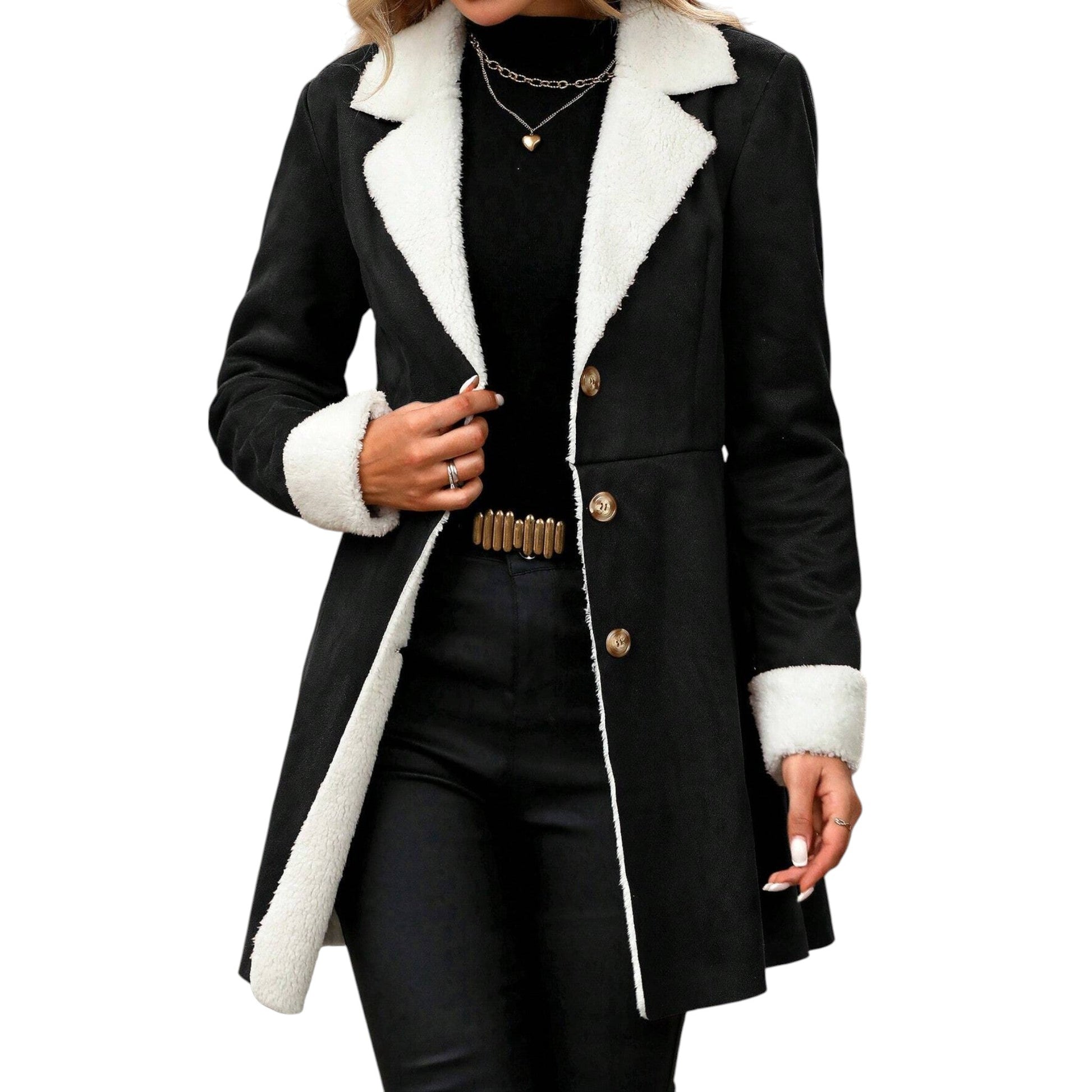 Címke nélküli, fekete, hosszú ujjú kabát, fehér műszőrme gallérral és mandzsettával, elöl gombokkal.