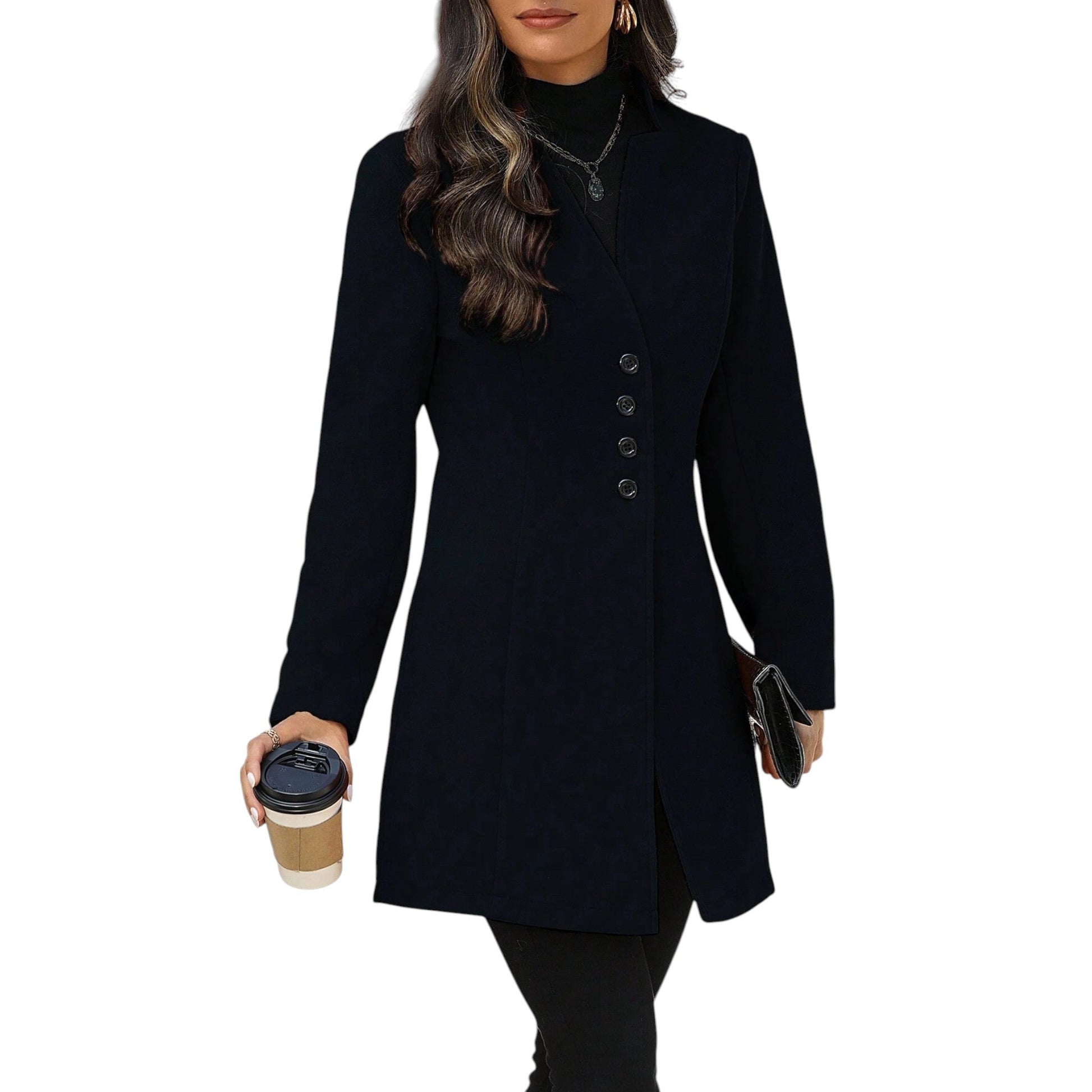 Címke nélküli, fekete, hosszú ujjú, gombos, állógalléros kabát.
