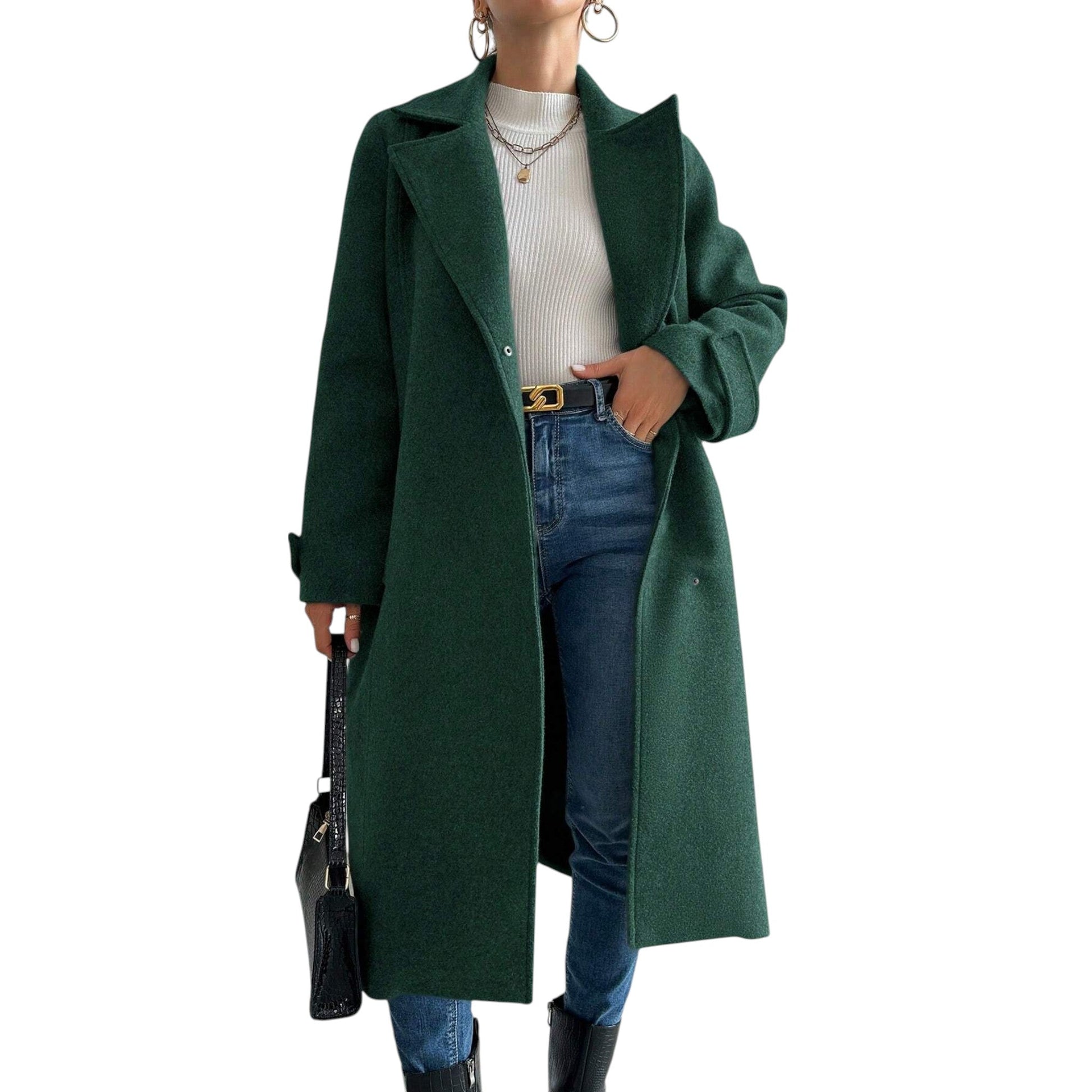 Címke nélküli, sötétzöld, hosszú gyapjúkabát. Galléros, hosszú ujjú, elöl gombsoros záródású. Két zsebbel.