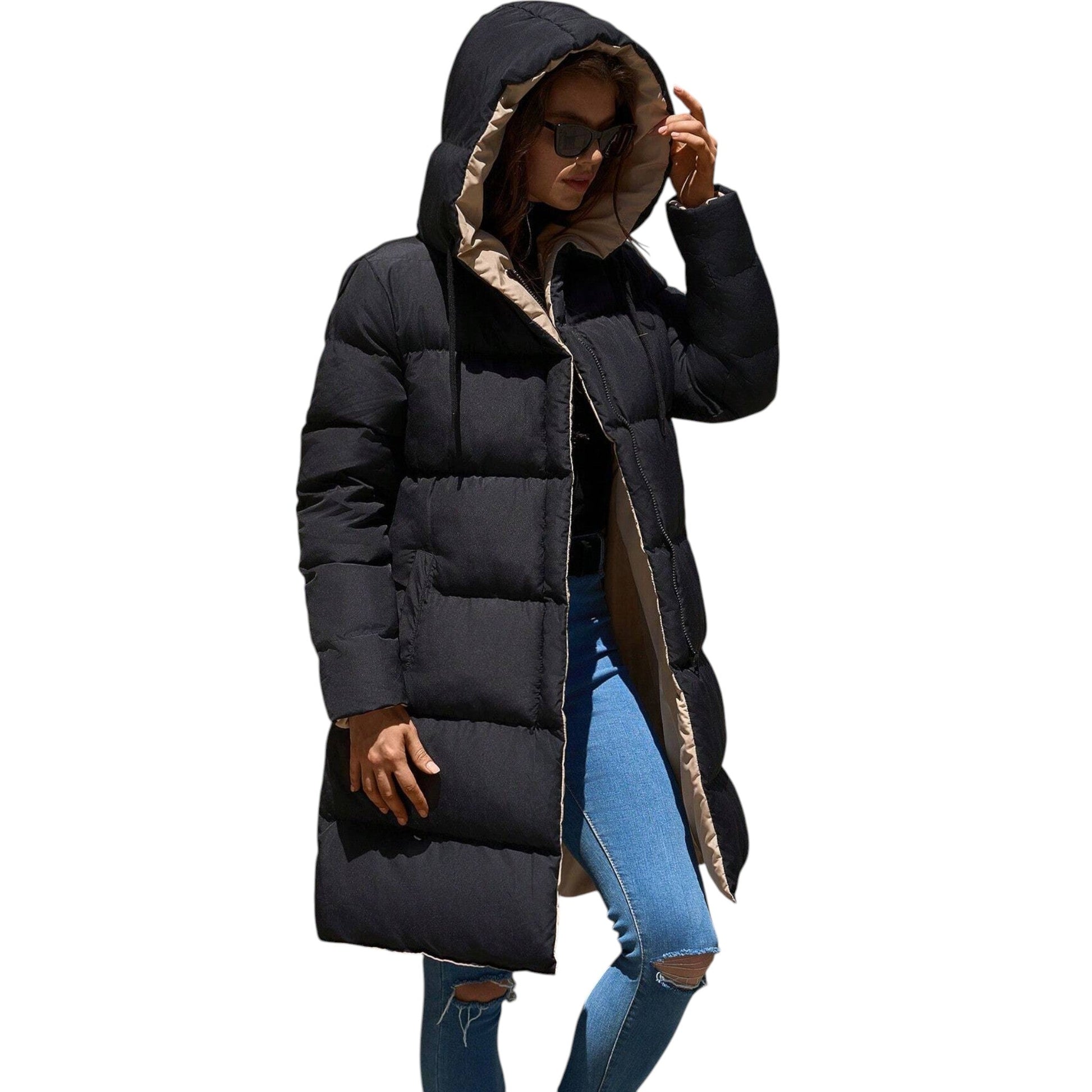 Címke nélküli, fekete, hosszú, steppelt kabát, kapucnival és zsebekkel, elöl cipzárral.