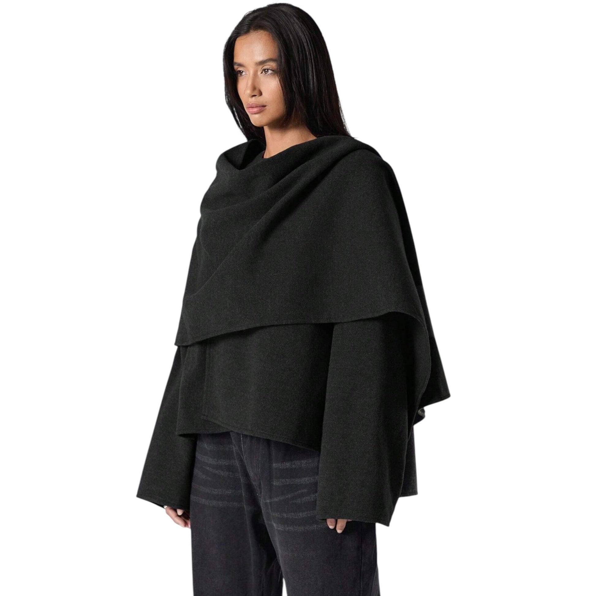 Címke nélküli, fekete, kötött poncsó pulóver, széles ujjal és ráhajló gallérral.