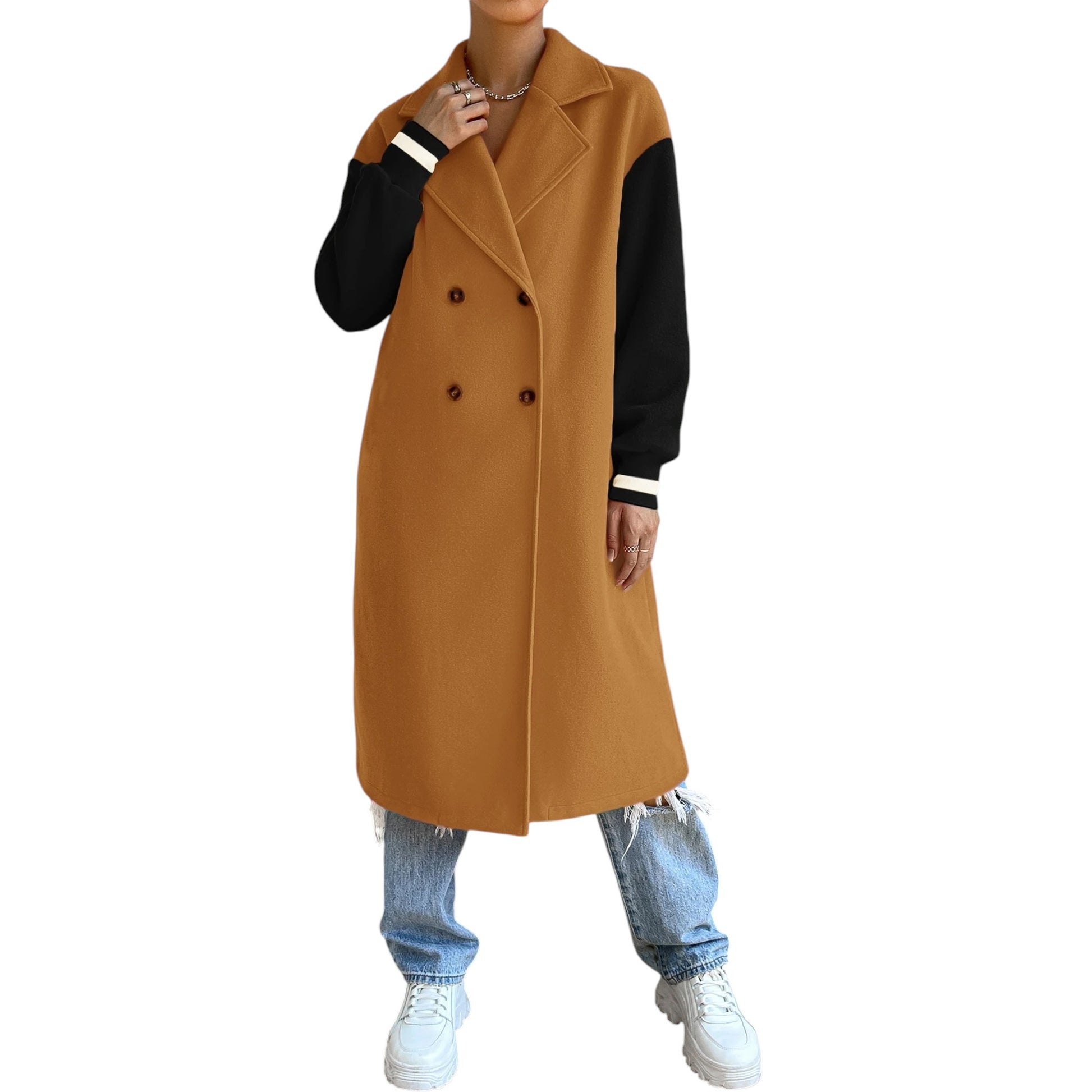 Címke nélküli, teve barna, hosszú kabát, dupla gombos záródással, fekete ujjakkal, melyeken csíkos szegély található.
