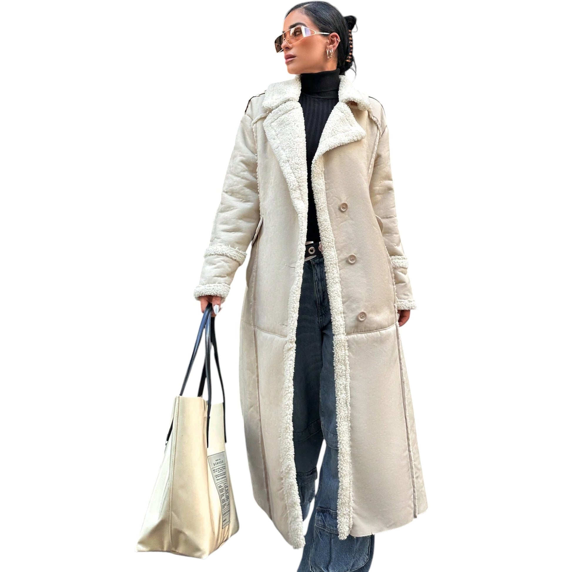 Címke nélküli, vajszínű, hosszú ujjú, belső szőrmés, hosszú télikabát.