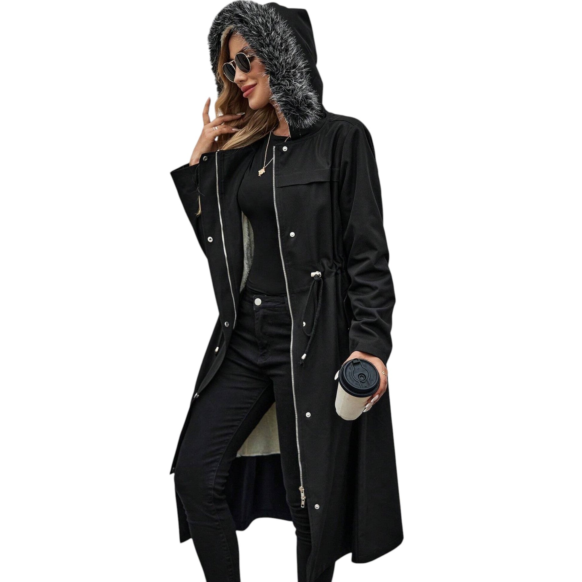 Címke nélküli, fekete, hosszú ujjú, cipzáras, gombos, műszőrme szegélyű kapucnis, derékban húzott, hosszú téli kabát.