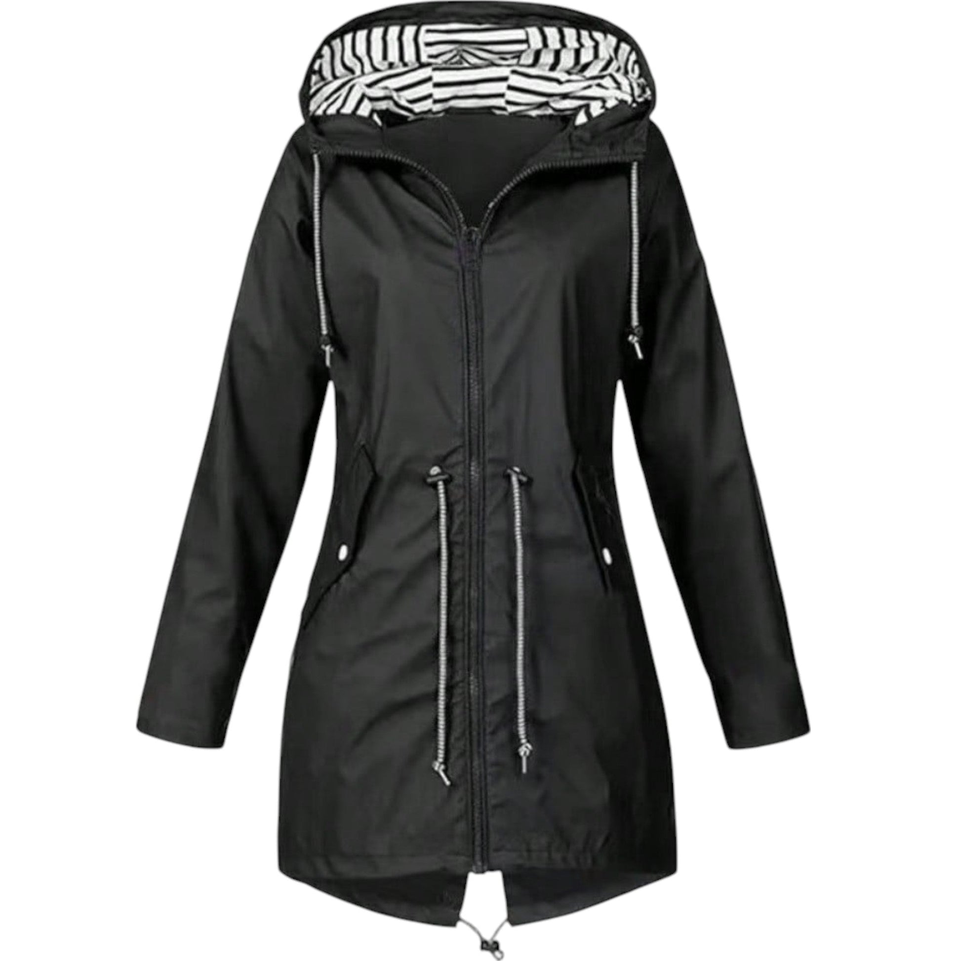 Címke nélküli, fekete, kapucnis, cipzáros, húzózsinóros, csíkos béléssel.