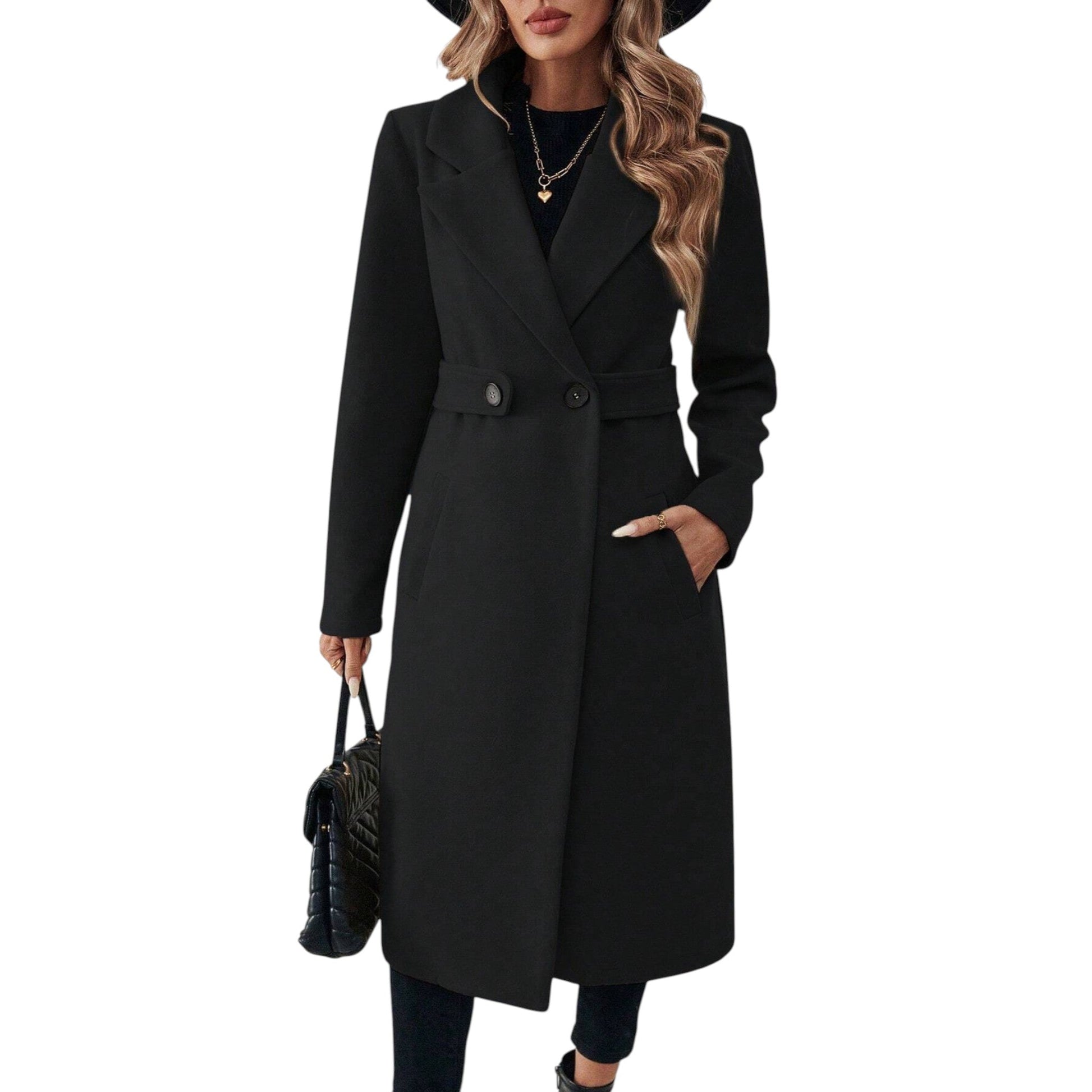 Címke nélküli, fekete, hosszú, galléros, megkötős derekú, duplasoros gombos, két oldalzsebbel.