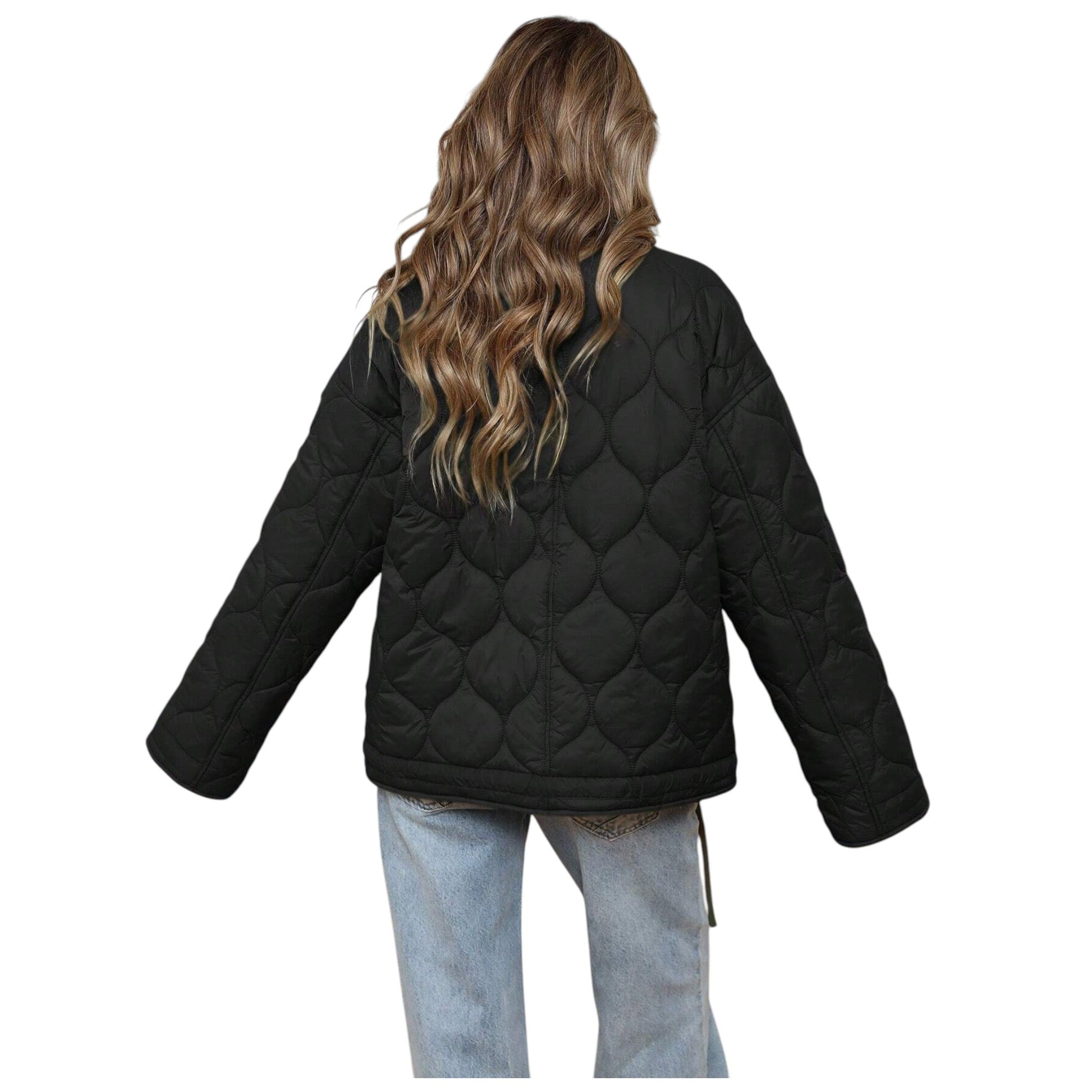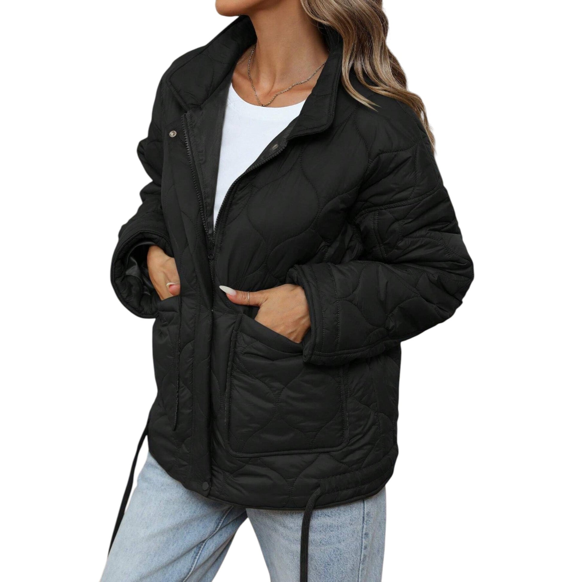 Címke nélküli, fekete, steppelt mintázatú, cipzáros, galléros, hosszú ujjú, két zsebbel, húzózsinórral az alján.