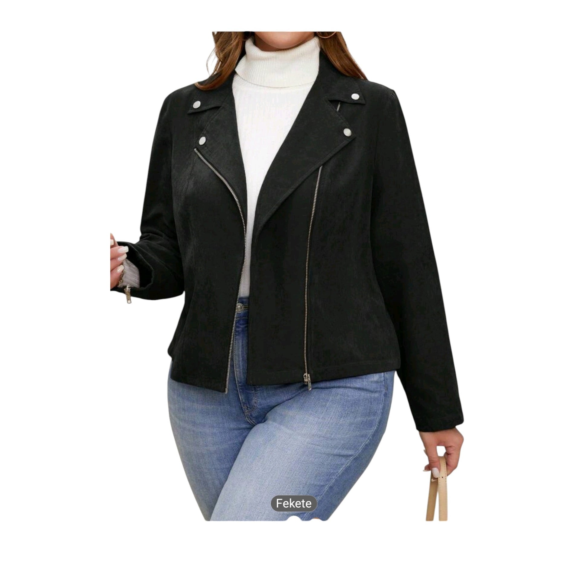 Címke nélküli, fekete, aszimmetrikus cipzár, hajtóka, hosszú ujjú, rövid dzseki.