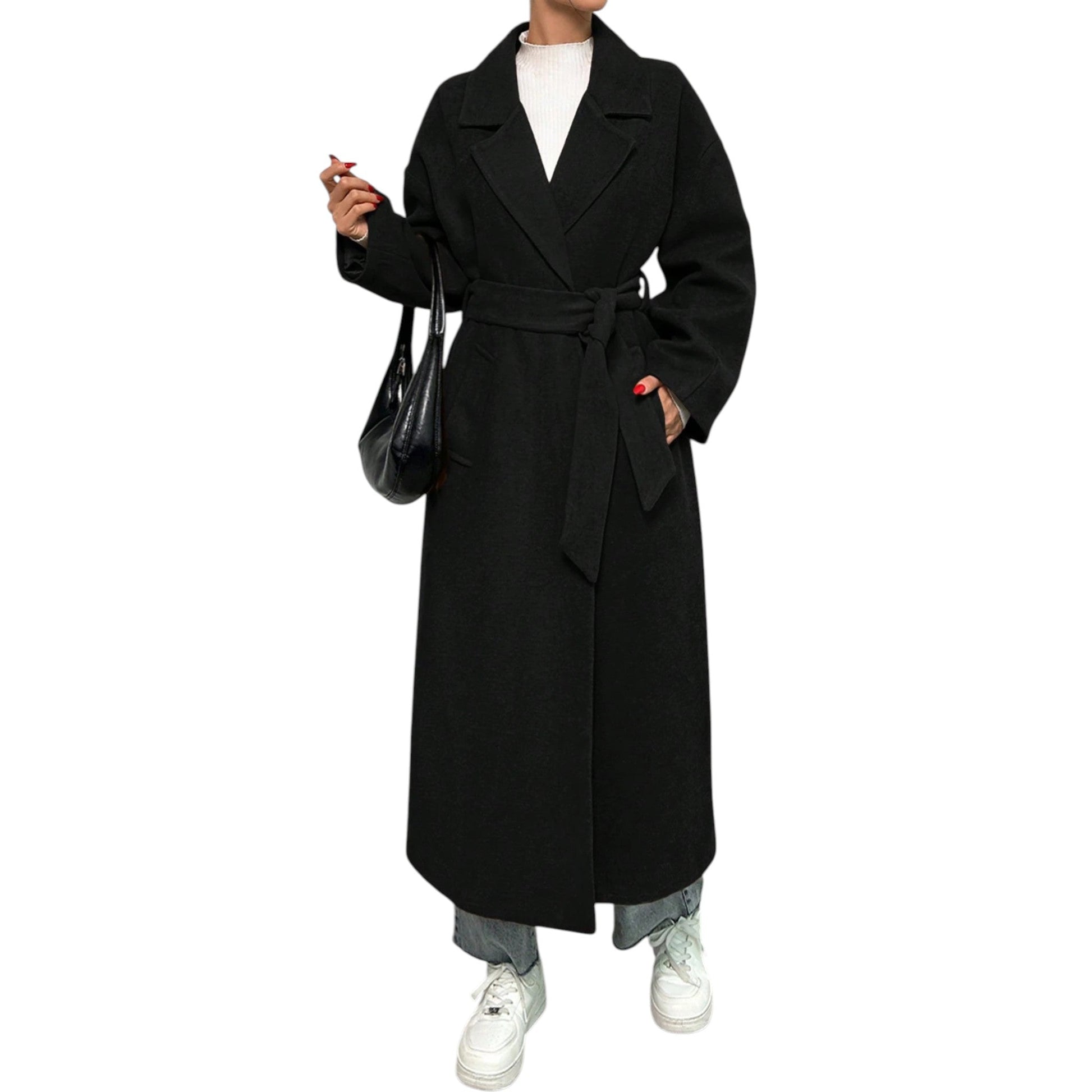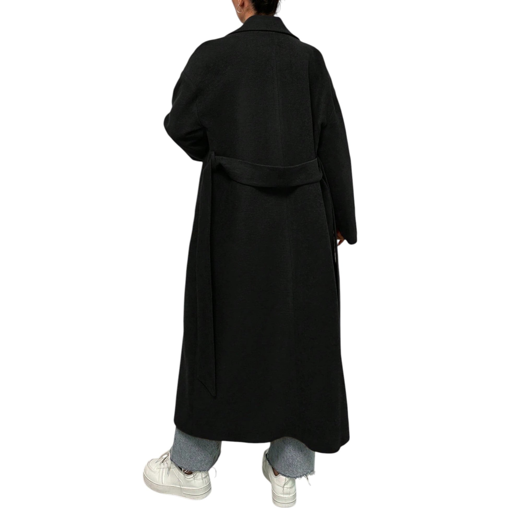 Címke nélküli, fekete, hosszú, galléros, megkötős derekú, két oldalzsebbel.