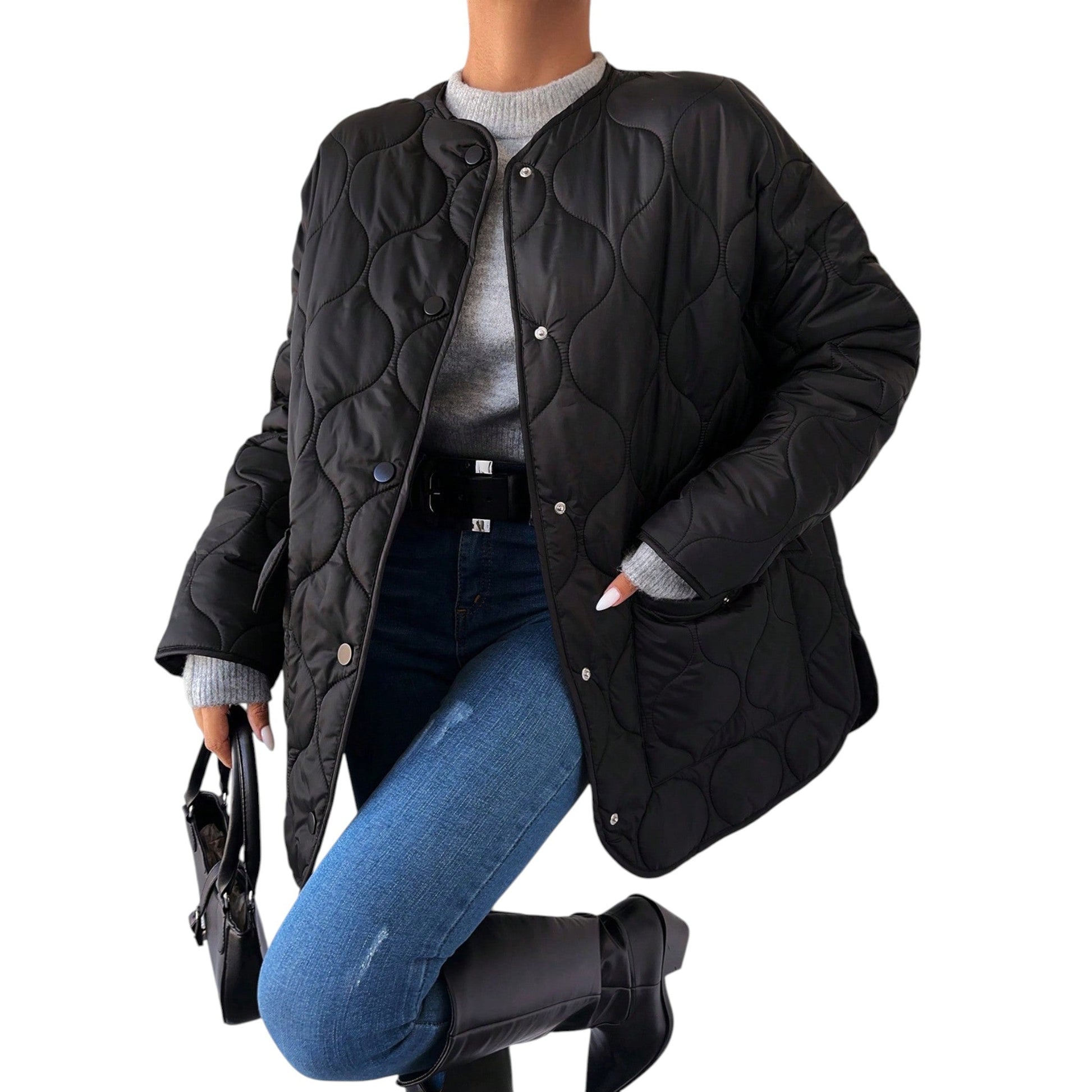 Címke nélküli, fekete, steppelt mintázatú, gombos, kerek nyakú, hosszú ujjú, két zsebbel.
