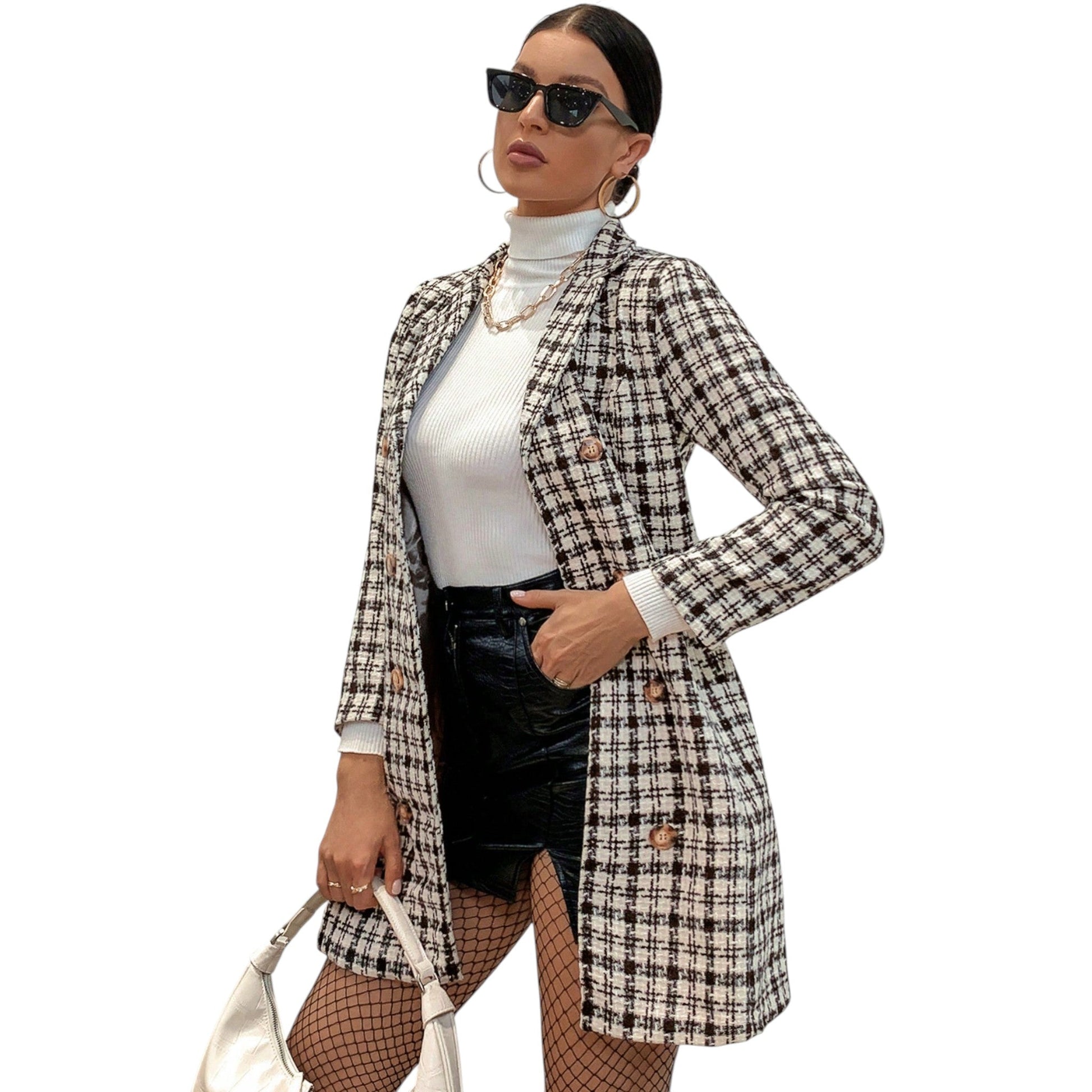 Címke nélküli, fekete és bézs kockás mintás, galléros, duplasoros gombos, hosszú szabású.
