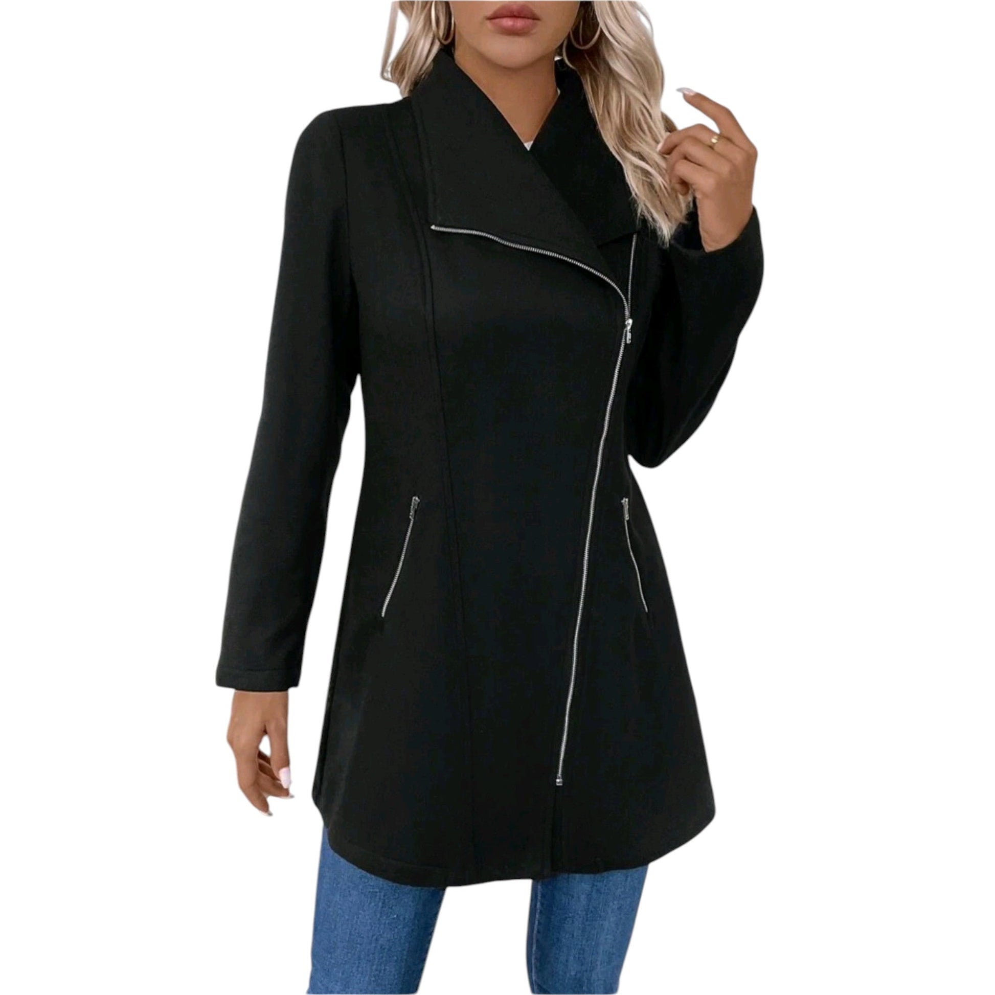 SHE fekete aszimmetrikus cipzáras kabát
