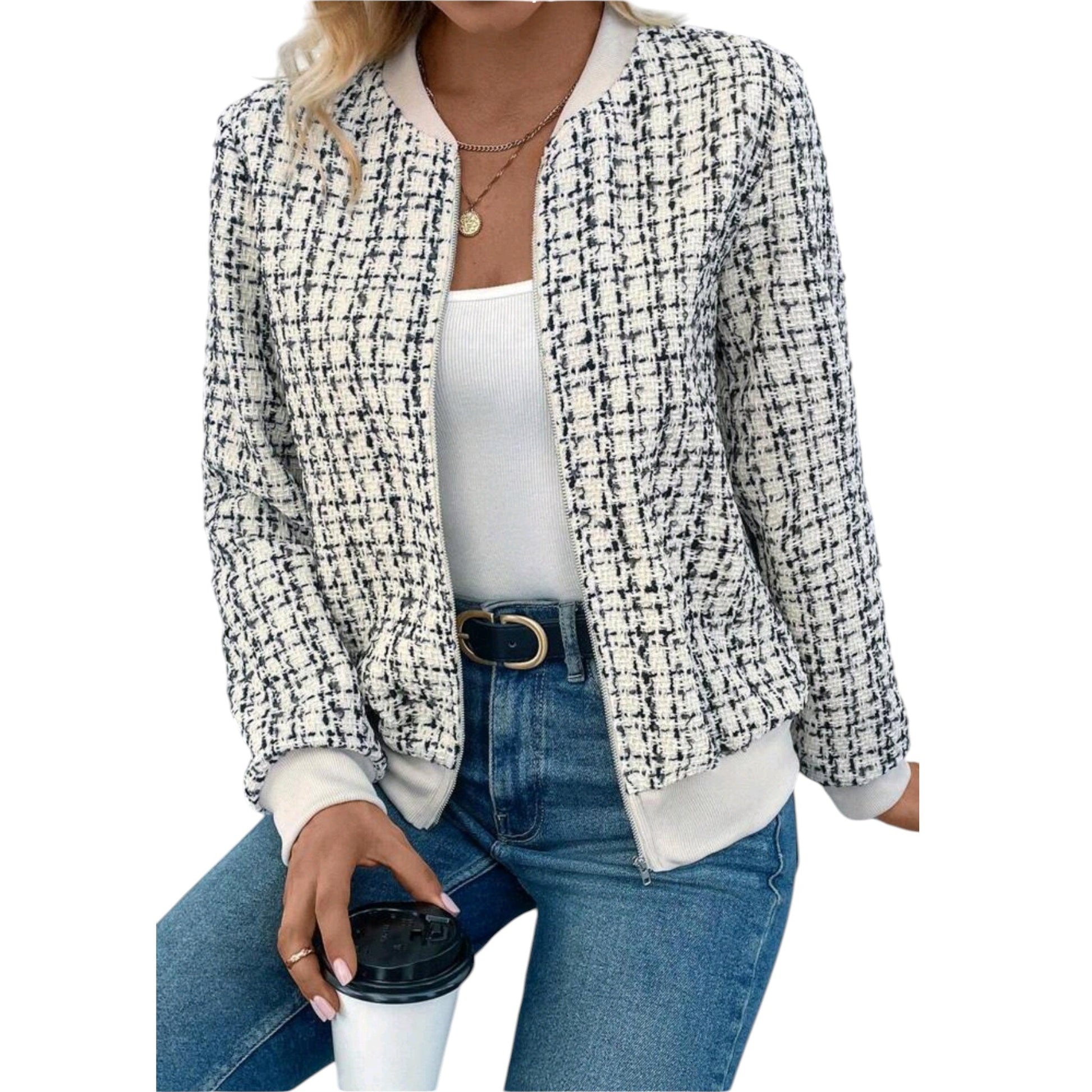 Címke nélküli, fekete-fehér kockás mintás, cipzáras bomber dzseki, bézs mandzsettával és aljjal.
