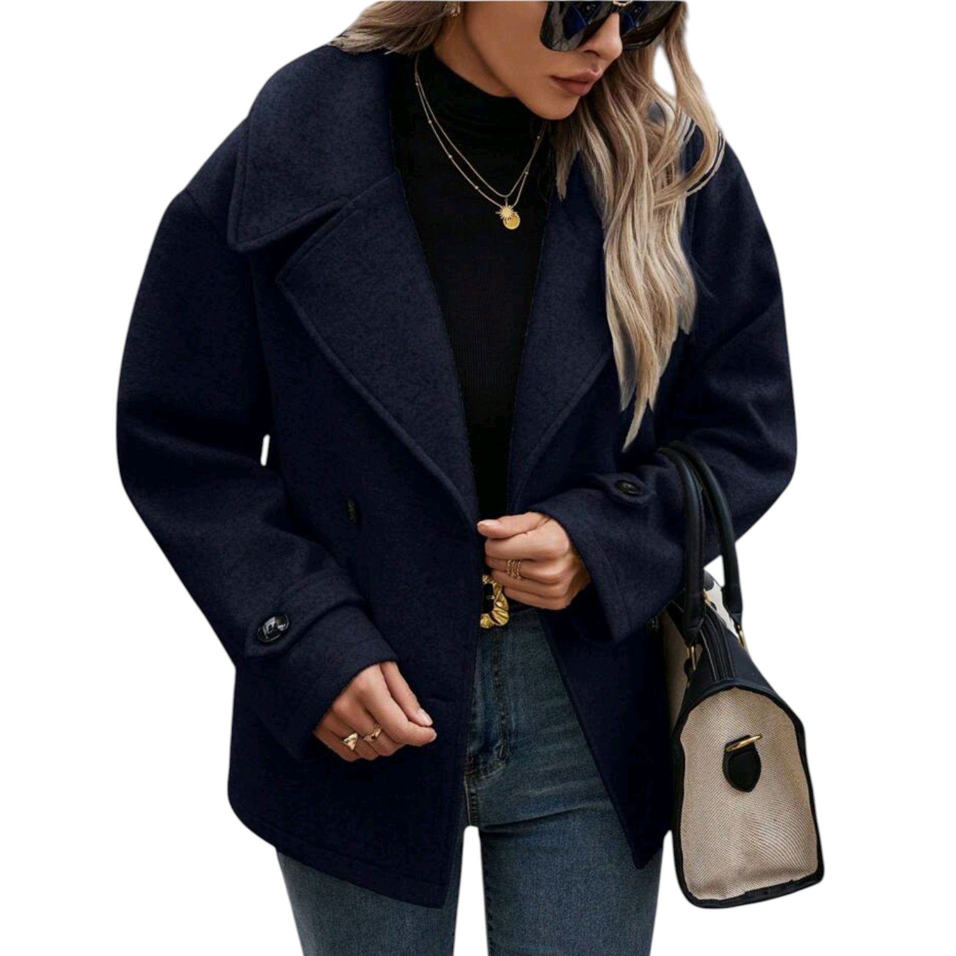 Címke nélküli, sötétkék, oversized, kétsoros gombos rövid kabát, széles gallérral.