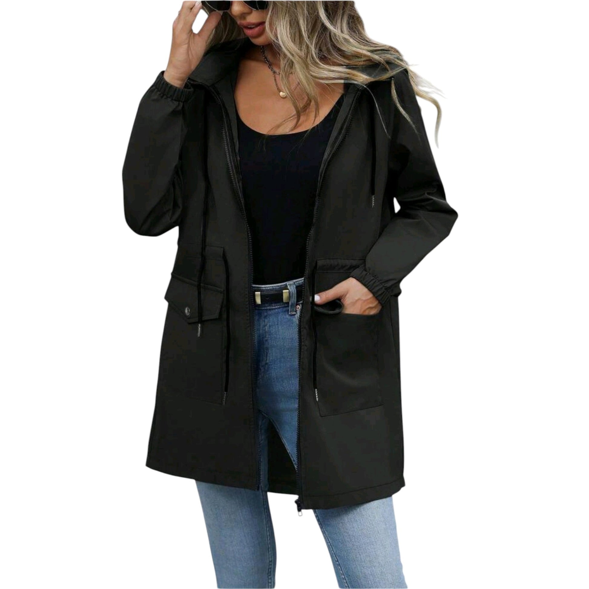 Címke nélküli, fekete, könnyű, kapucnis parka, zsinórral és zsebekkel.