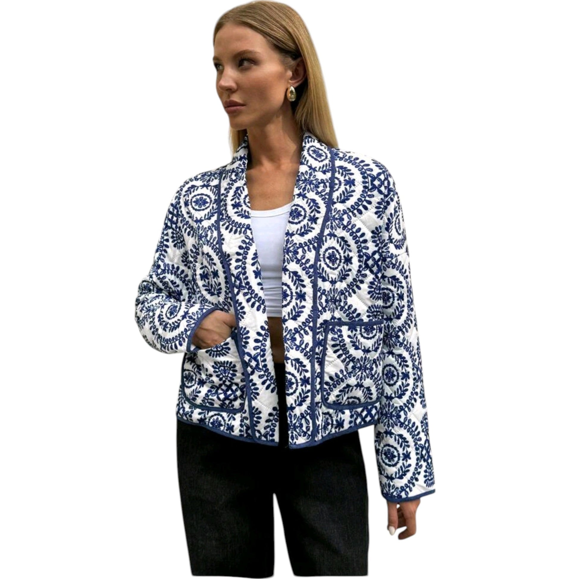 Címke nélküli, kék-fehér mintás steppelt dzseki, nyitott fazon, zsebekkel.