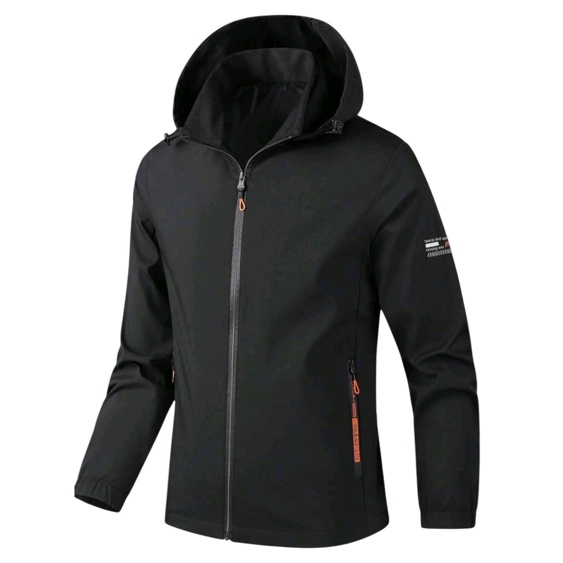 Címke nélküli, fekete, kapucnis softshell kabát, cipzáras záródással, cipzáras zsebekkel.