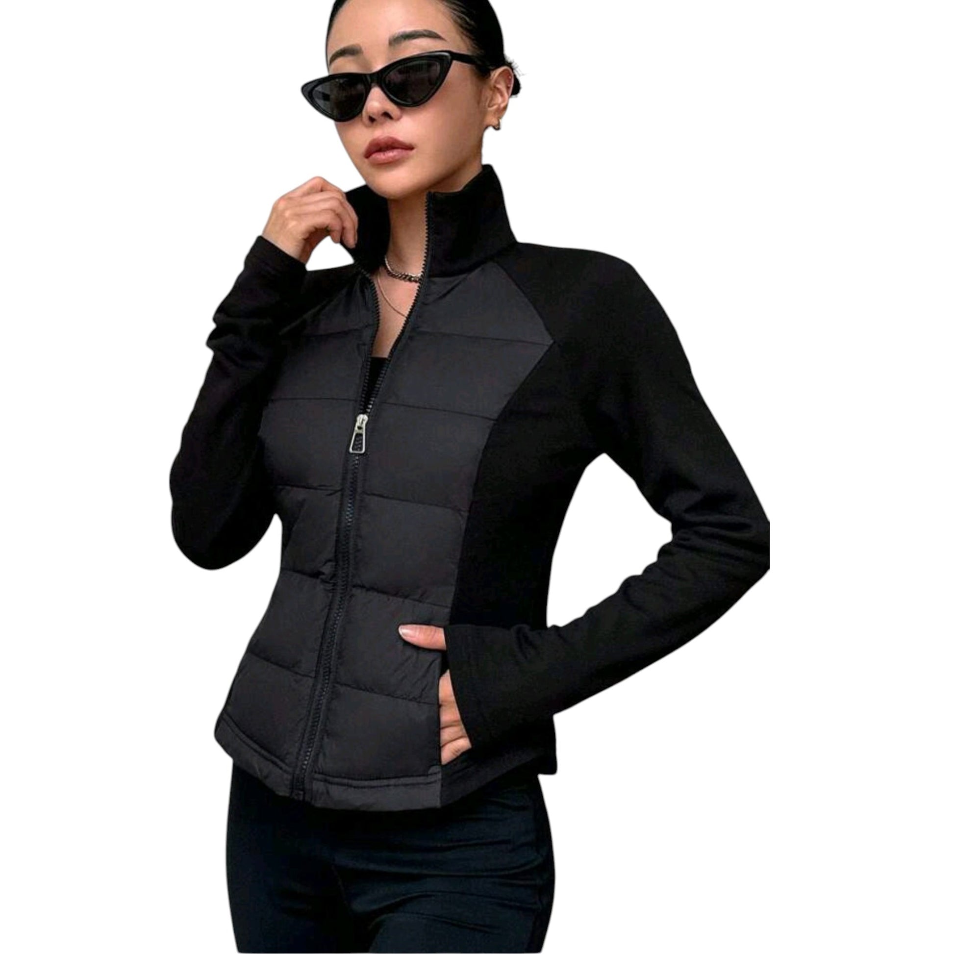 Címke nélküli, fekete, hibrid sportdzseki, steppelt előlappal, cipzáras záródással és magas nyakkal.