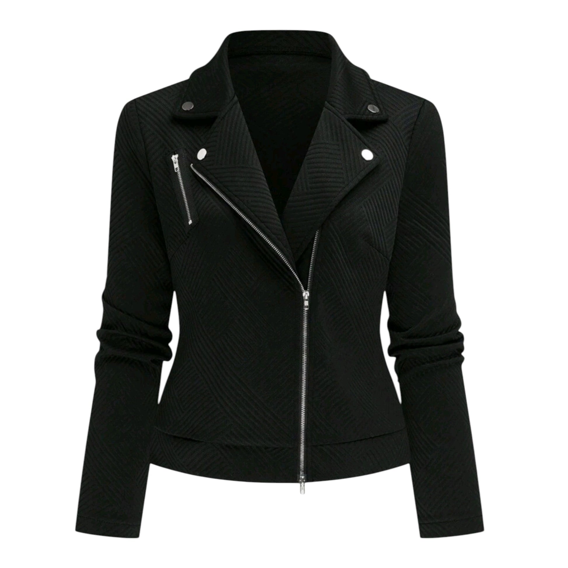 Címke nélküli, fekete, texturált, slim fit motoros dzseki, aszimmetrikus cipzárral és patentos gallérral.