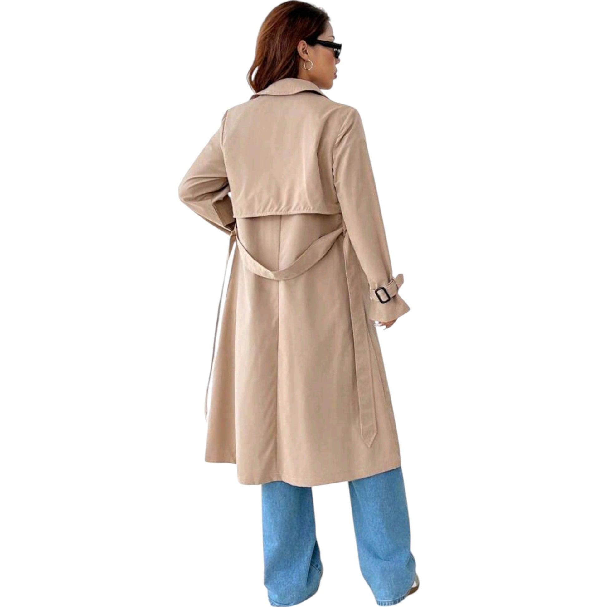Címke nélküli, bézs, hosszú ballonkabát övvel, hátulról fotózva.