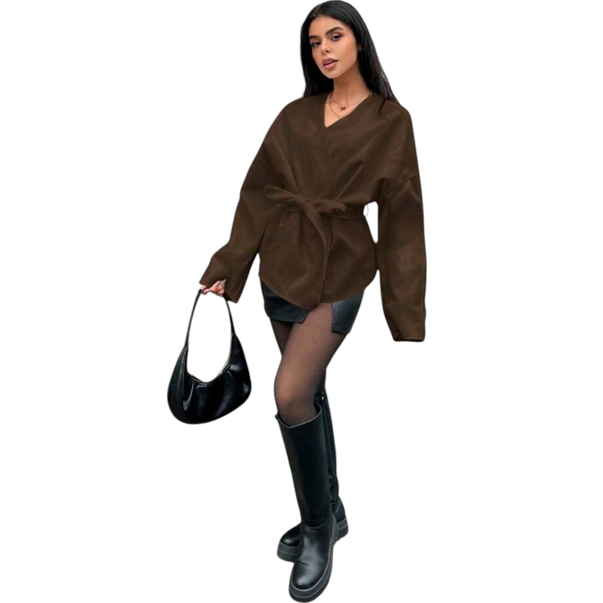 Címke nélküli, barna, hosszú ujjú, V-nyakú, derékban megkötős.
