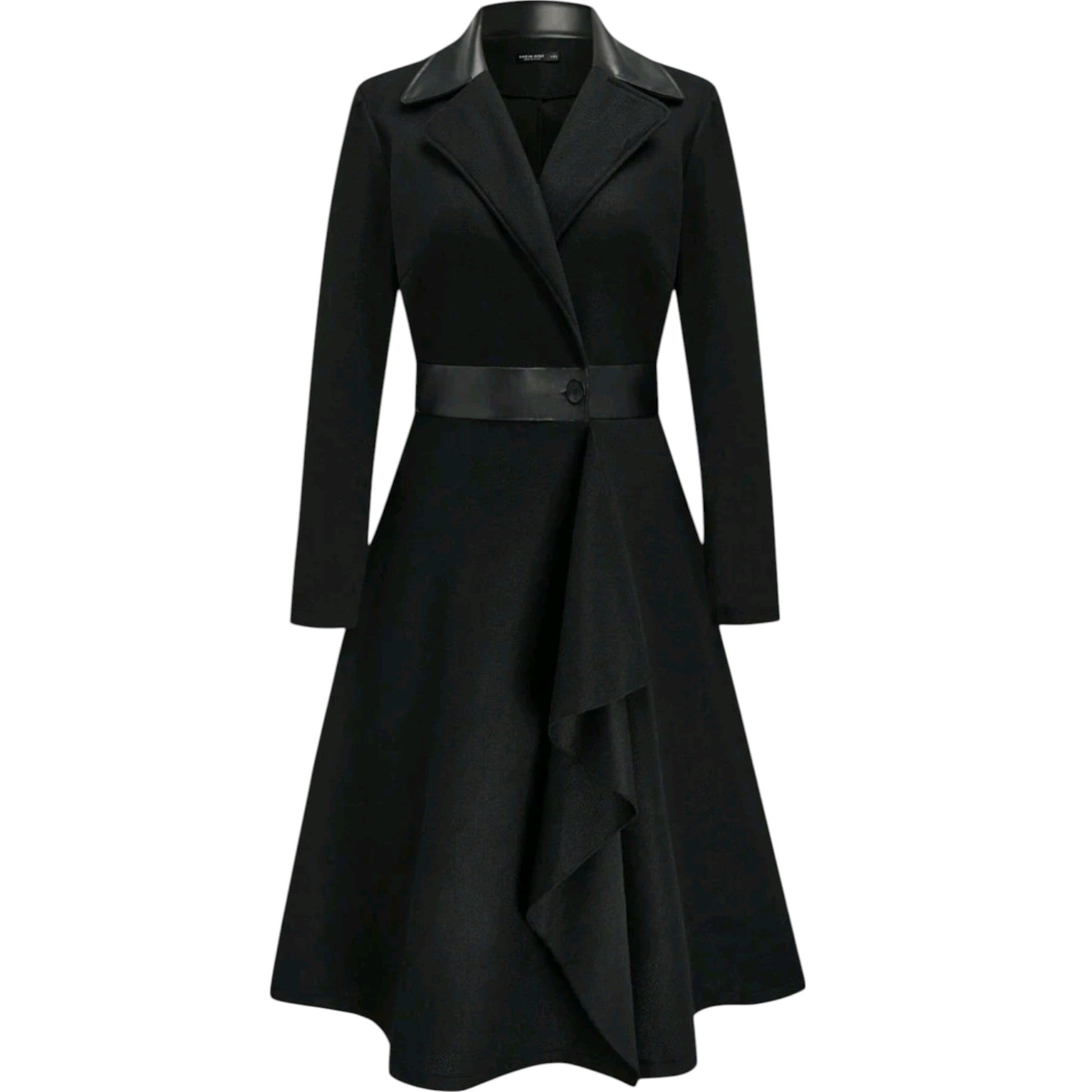 Címke nélküli, fekete, hosszú ujjú, műbőr gallérral és övvel, aszimmetrikus fodros aljú.