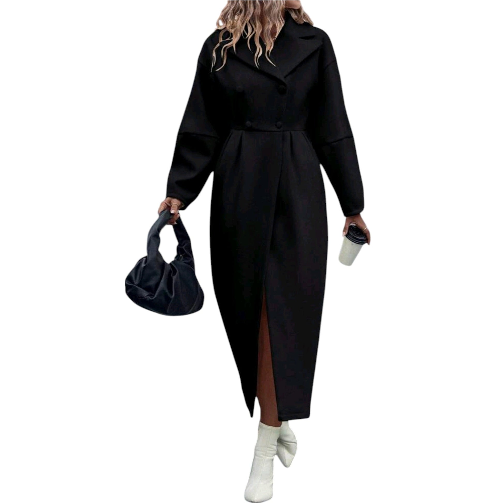 Címke nélküli, fekete, hosszú ujjú, galléros, gombos, maxi hosszúságú, oldalt felsliccelt.