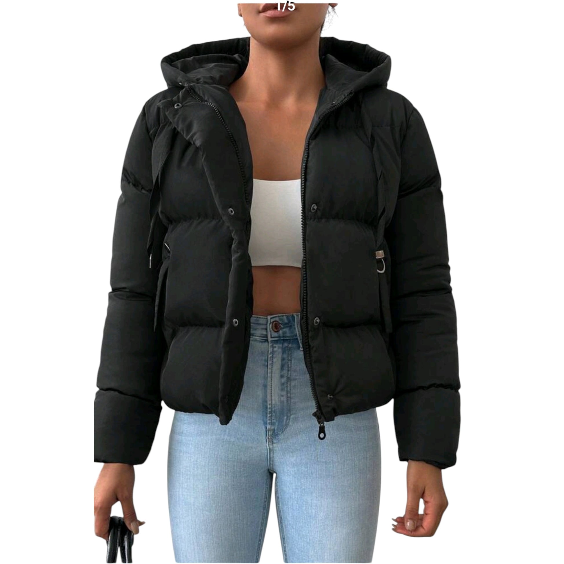 Címke nélküli, fekete, kapucnis, rövid pufidzseki, cipzáras.