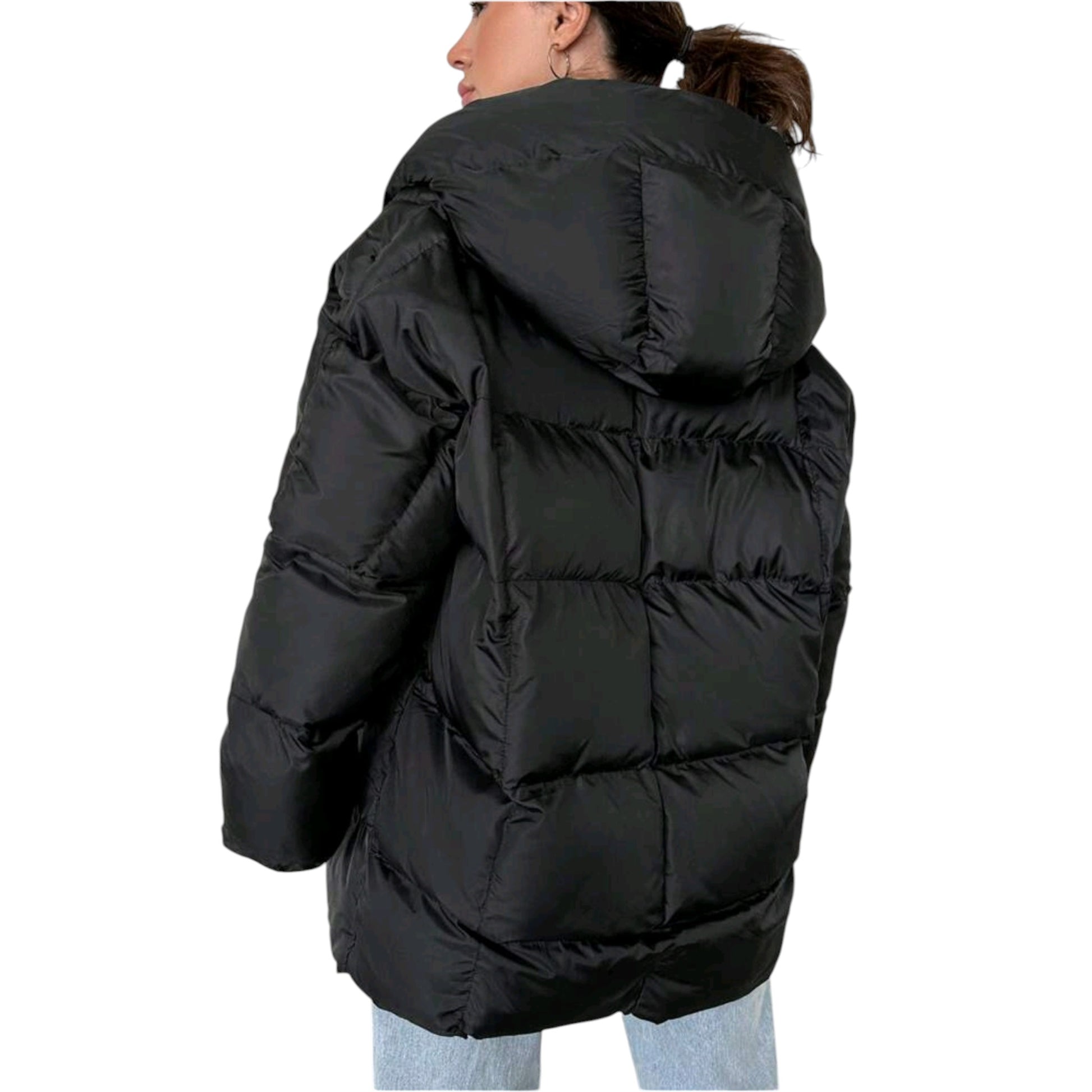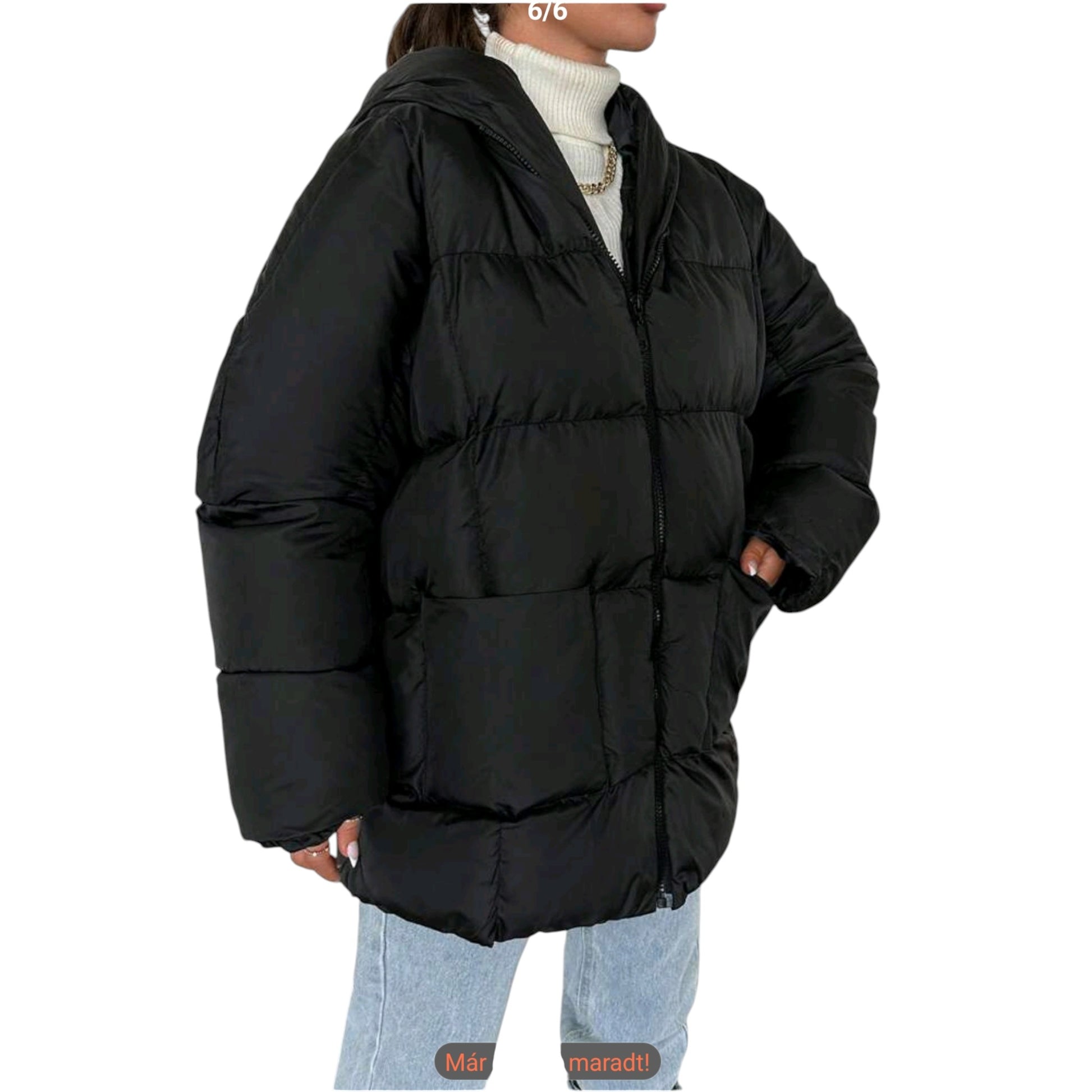 Címke nélküli, fekete, kapucnis, hosszú ujjú, vastag bélelt kabát, cipzáras.