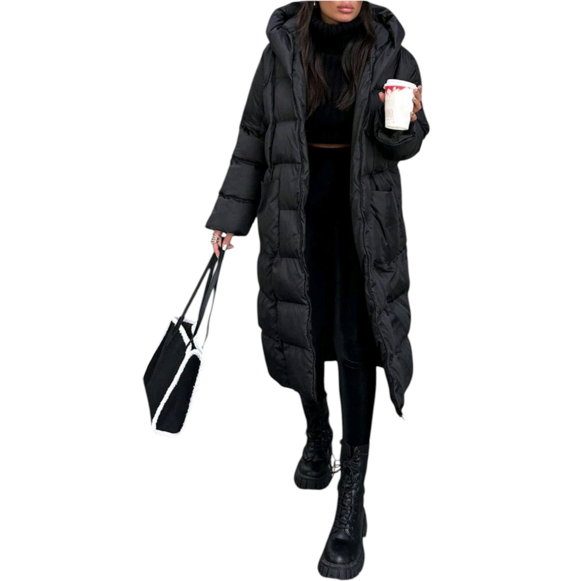 Címke nélküli, fekete, kapucnis, hosszú bélelt kabát, cipzárral.