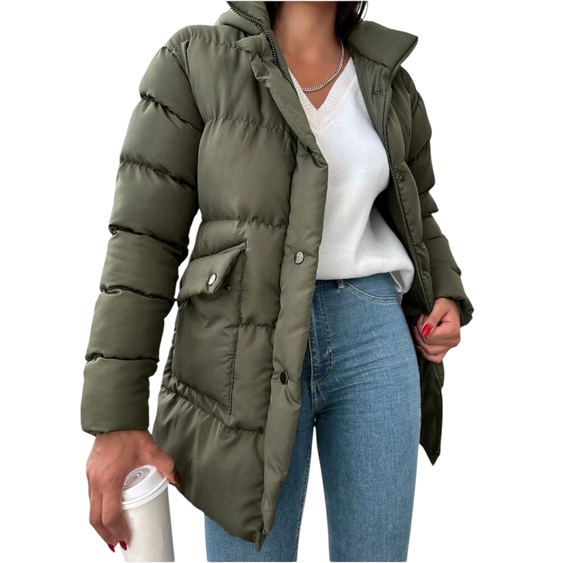 Címke nélküli, zöldes barna, kapucnis, bélelt kabát, dupla cipzáras és patentos záródással, megkötős derekú.