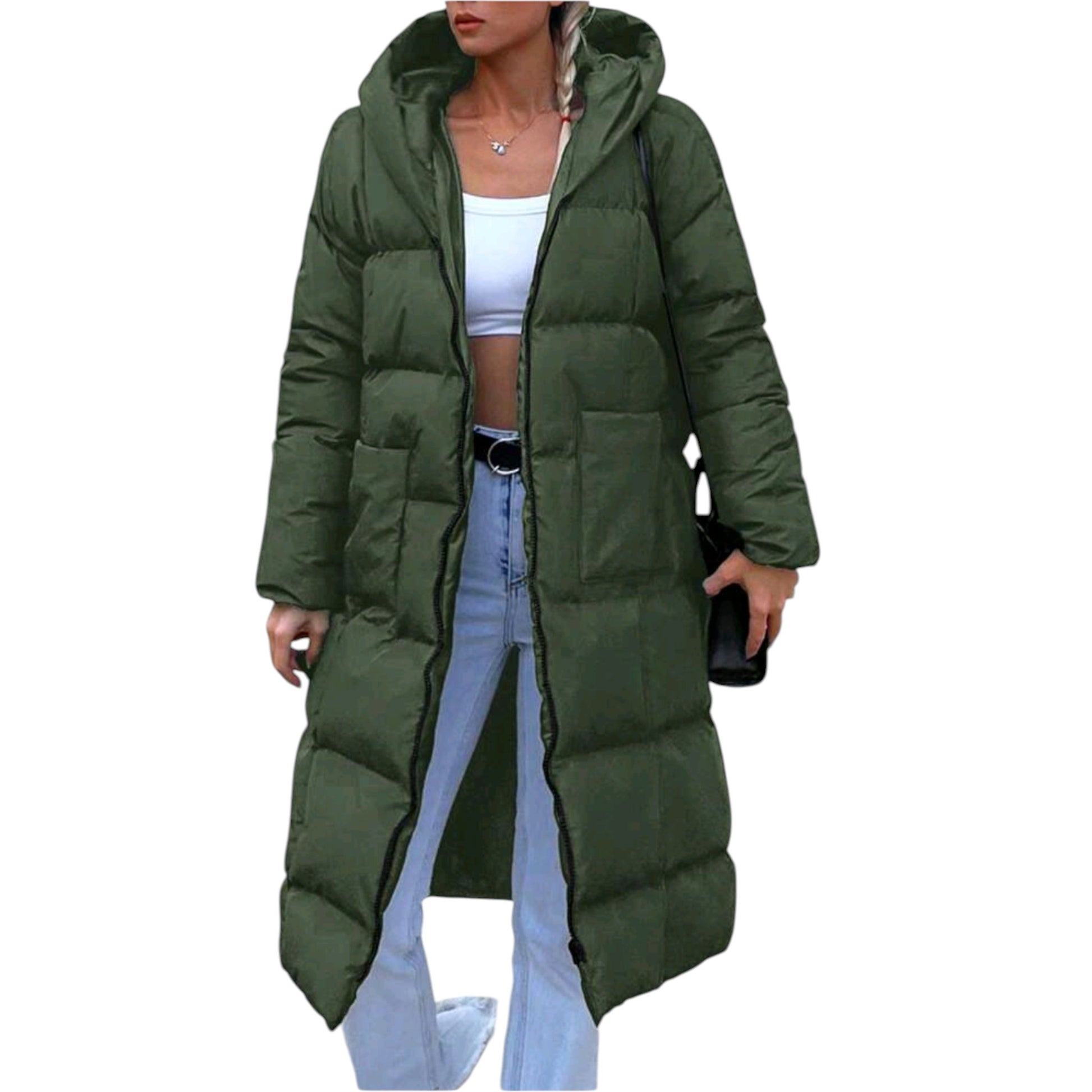 Címke nélküli, katonai zöld, kapucnis, hosszú bélelt kabát, cipzárral.