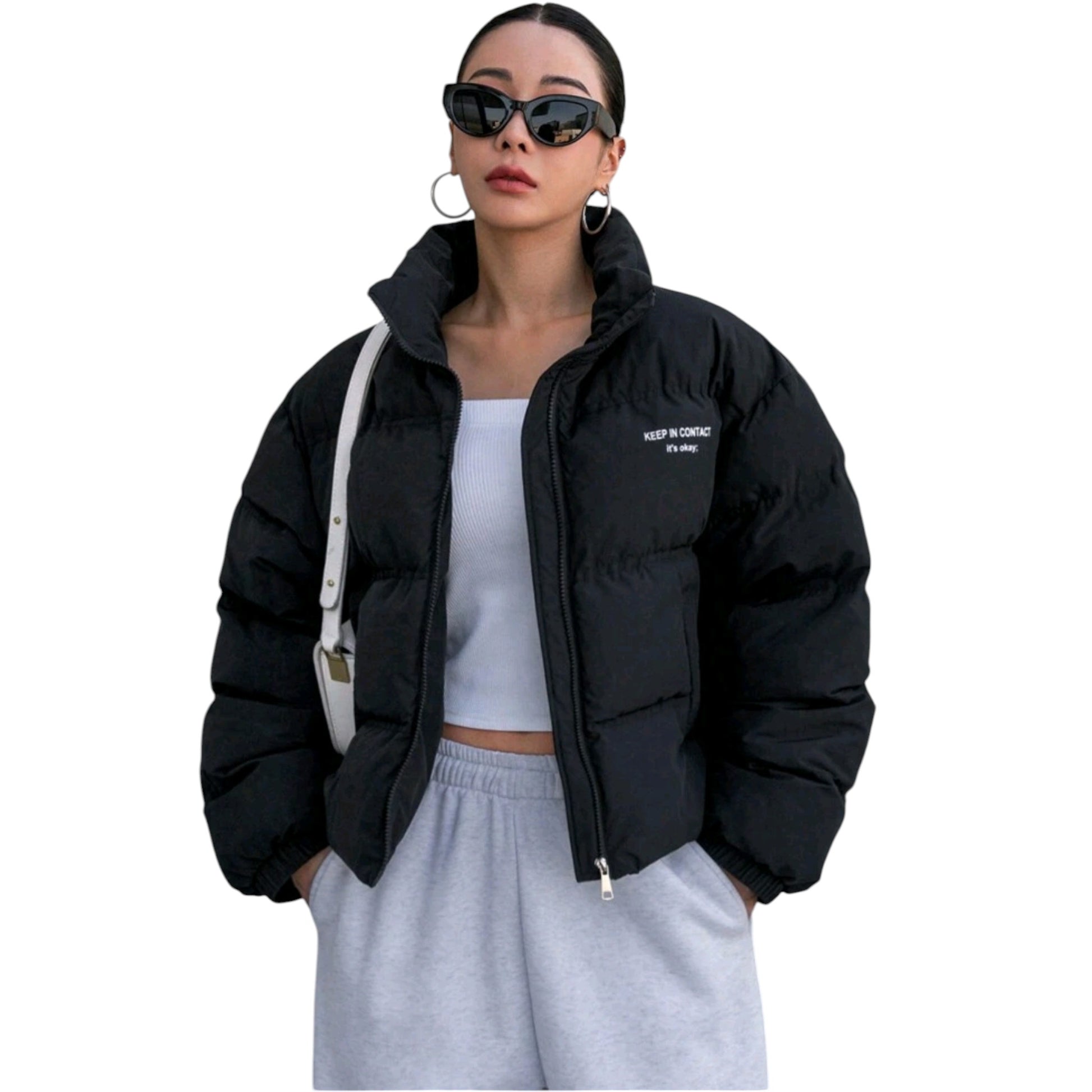 Címke nélküli, fekete, vastag bélelt dzseki, magas gallérral, cipzárral, elöl felirattal.