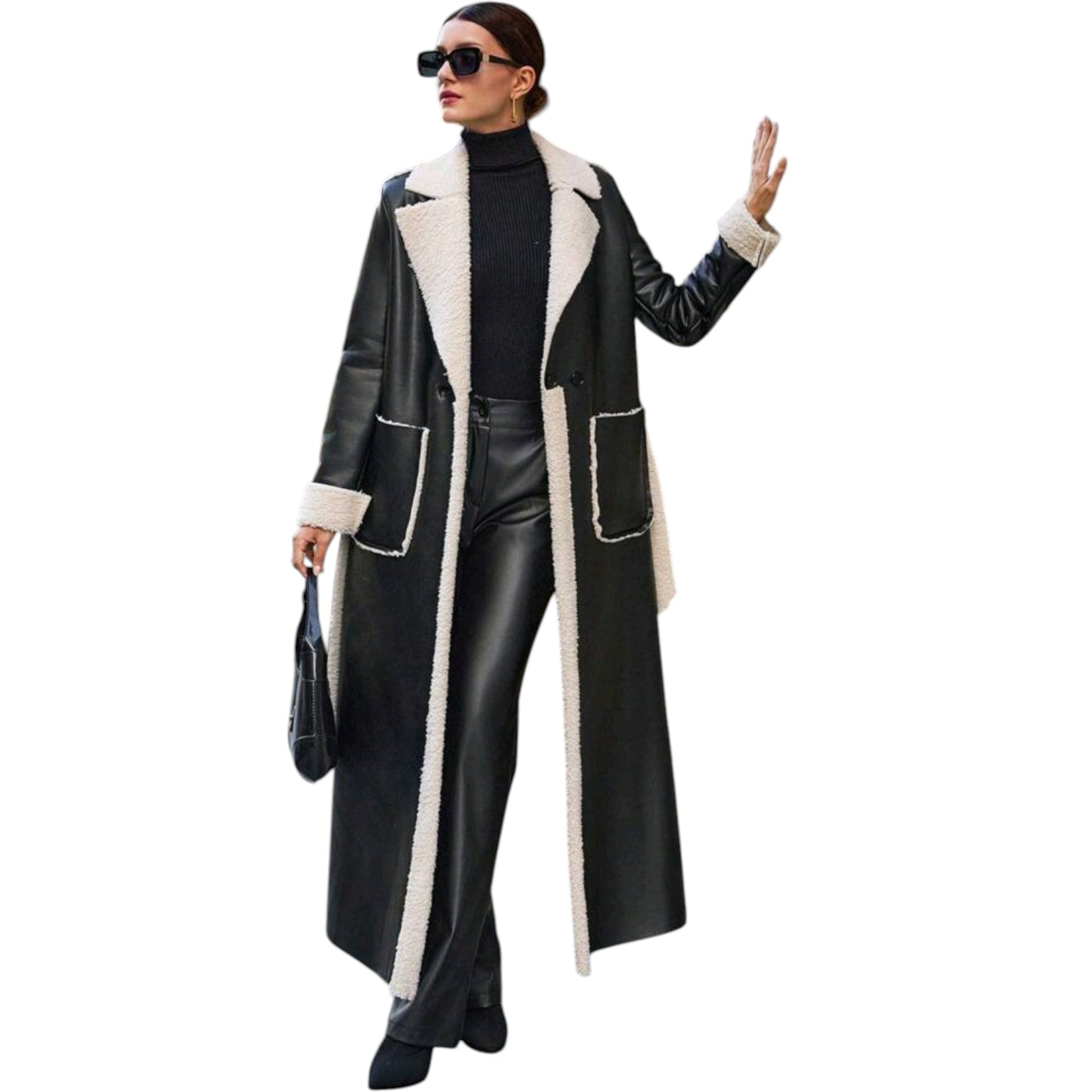 Címke nélküli, fekete, hosszú műbőr kabát, műszőrme béléssel.