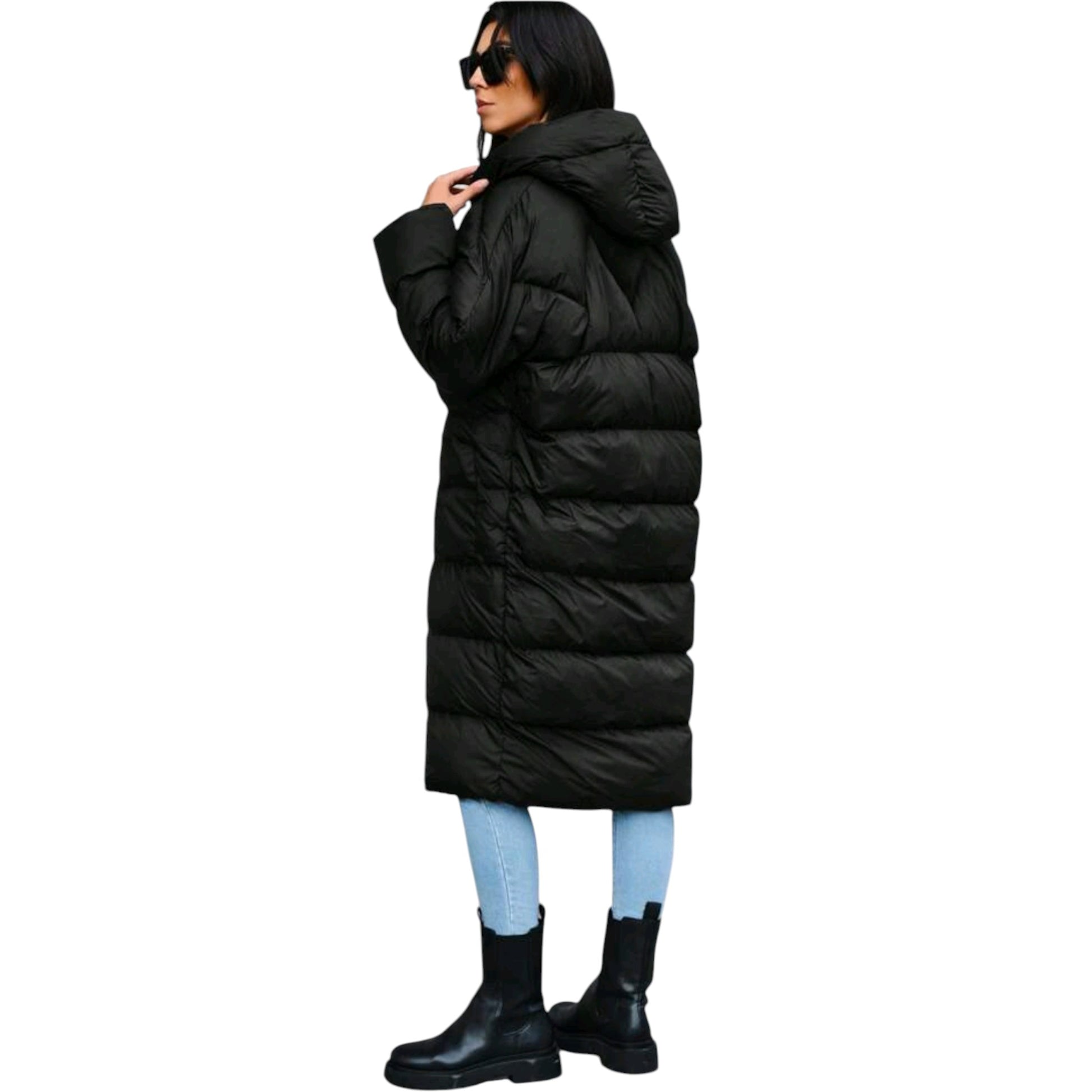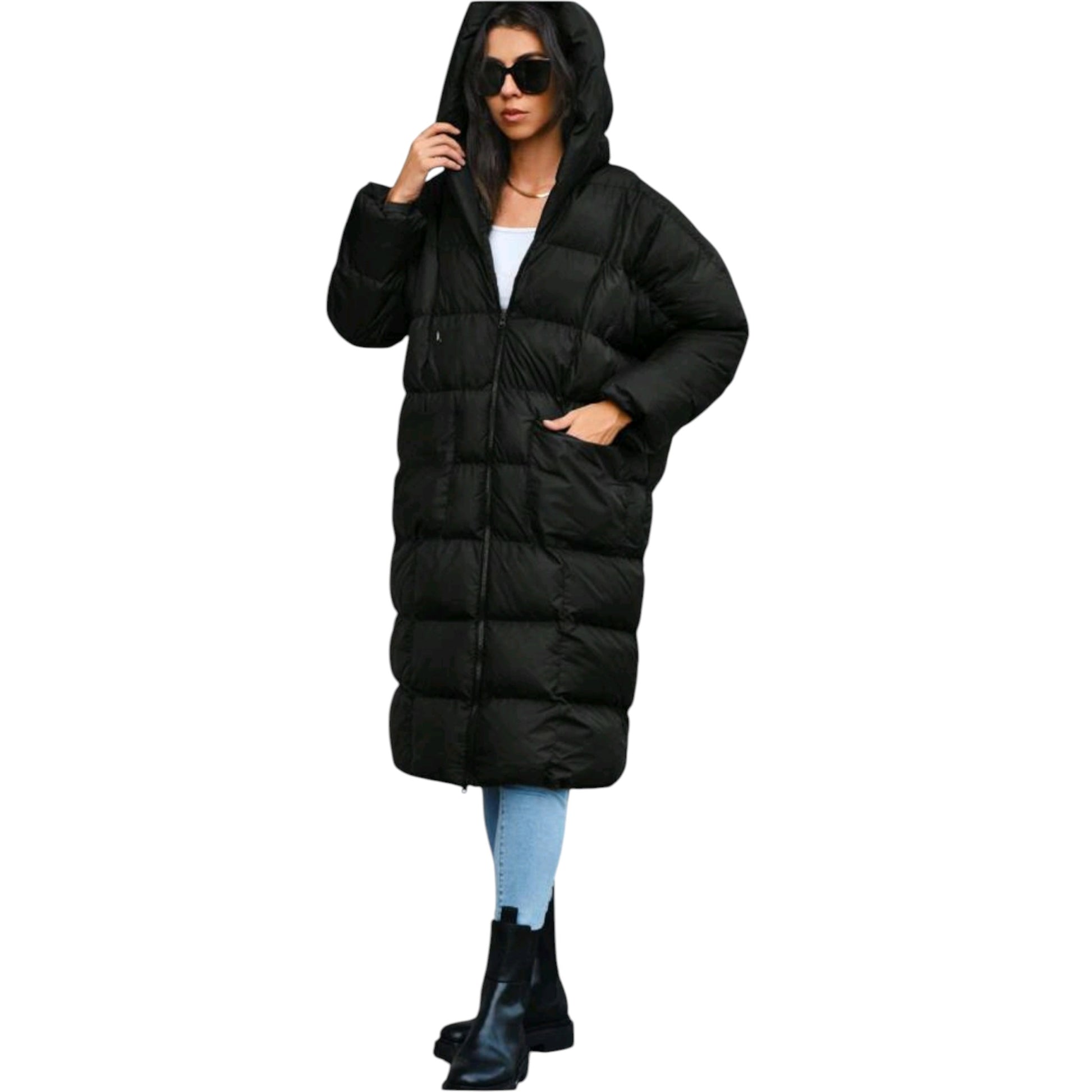 Címke nélküli, fekete, hosszú pufi kabát kapucnival és cipzárral.