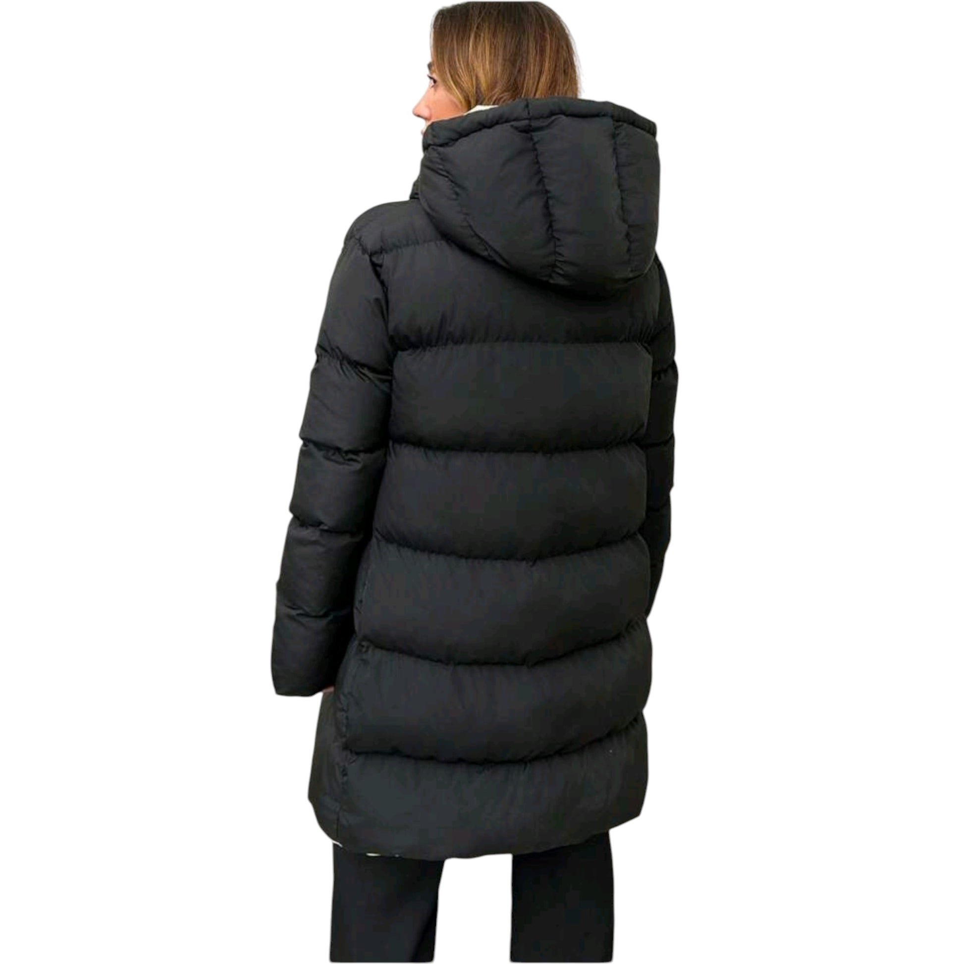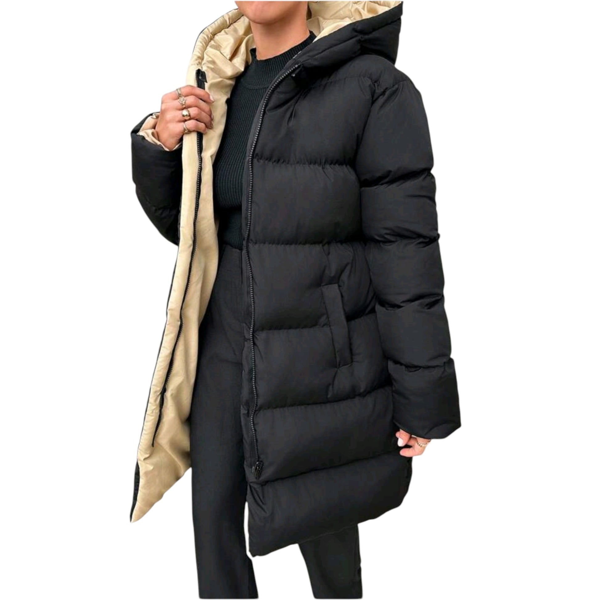 Címke nélküli, bézs/fekete, hosszú, kifordítható pufi kabát, kapucnival és cipzárral.