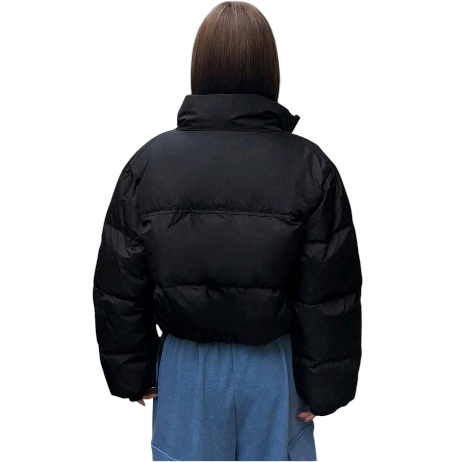 Címke nélküli, fekete, rövid, puha tapintású pufi dzseki, cipzárral és magasított gallérral.